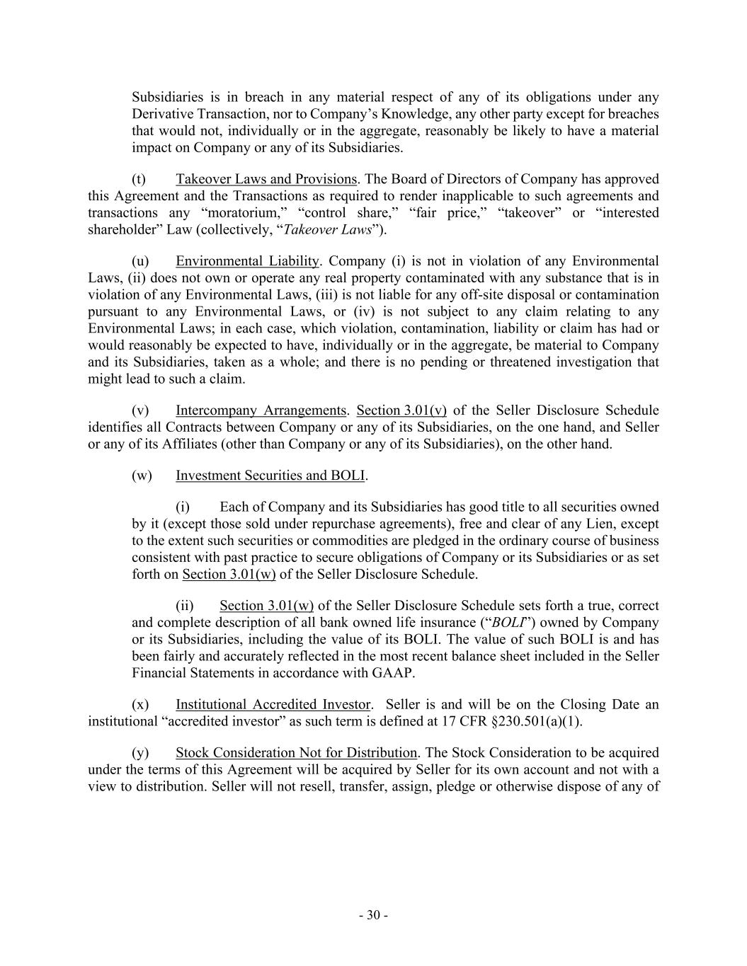 -30-子公司在任何重大方面违反其在任何衍生交易项下的任何义务,据公司所知,也没有违反任何其他方,但个别或总体上不会合理地可能对公司或其任何子公司产生重大影响的违约除外。(t)接管法律和规定。公司董事会已按规定批准本协议及交易,使该等协议及交易不适用任何“暂停”、“控制权份额”、“公平价格”、“接管”或“利害关系股东”法(统称“收购法”)。(u)环境责任。公司(i)没有违反任何环境法,(ii)没有拥有或经营任何被任何违反任何环境法的物质污染的不动产,(iii)没有根据任何环境法对任何场外处置或污染承担责任,或(iv)不受任何与任何环境法有关的索赔的约束;在每种情况下,已经或将合理地预期已经存在的违规、污染、责任或索赔,单独或总体上,对公司及其子公司具有重大意义,作为一个整体;并且不存在可能导致此类索赔的未决或威胁调查。(五)公司间安排。卖方披露附表第3.01(v)节确定了公司或其任何子公司与卖方或其任何关联公司(公司或其任何子公司除外)之间的所有合同。(w)投资证券及BOLI。(i)各公司及其附属公司对其拥有的所有证券(根据回购协议出售的证券除外)拥有良好的所有权,不存在任何留置权,但此类证券或商品在正常业务过程中被质押的情况除外,该等证券或商品符合以往惯例,以担保公司或其附属公司的债务,或如卖方披露附表第3.01(w)节所述。(ii)卖方披露附表第3.01(w)节对公司或其子公司拥有的所有银行拥有的人寿保险(“BOLI”)进行了真实、正确和完整的描述,包括其BOLI的价值。根据公认会计原则,此类BOLI的价值现在并已经公平、准确地反映在卖方财务报表中最近的资产负债表中。(x)机构认可投资者。卖方现在是并将在交割日成为机构“合格投资者”,因为该术语的定义为17 CFR § 230.501(a)(1)。(y)不作分配的股票代价。根据本协议条款将获得的股票对价将由卖方为自己的账户而不是为了分配而获得。卖方不会转售、转让、转让、质押或以其他方式处置任何
