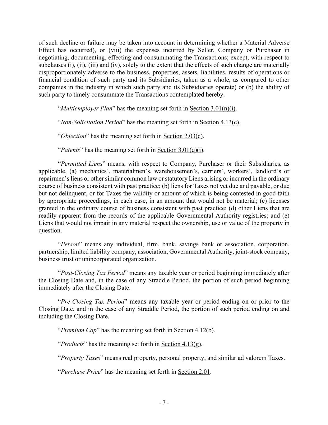 -7-在确定是否已发生重大不利影响时,可考虑此类下降或失败),或(viii)卖方、公司或买方在谈判、记录、实现和完成交易方面发生的费用;但就(i)、(ii)、(iii)和(iv)款而言,仅当此类变化的影响对该方及其子公司的业务、财产、资产、负债、经营业绩或财务状况整体而言具有重大不成比例的不利影响时,除外,与该方及其子公司经营所在行业的其他公司相比)或(b)该方及时完成本协议所设想的交易的能力。“多雇主计划”具有第3.01(n)(i)节规定的含义。“非征集期”具有第4.13(c)节规定的含义。“反对”具有第2.03(c)节规定的含义。“专利”具有第3.01(q)(i)节规定的含义。“许可留置权”是指,就公司、买方或其子公司(如适用)而言,(a)机械师、材料工、仓库工、承运人、工人、房东或修理工的留置权或其他类似的普通法或与过去惯例一致的业务过程中产生或产生的法定留置权;(b)对尚未到期应付或到期但未拖欠的税款的留置权,或对其有效性或金额正受到适当程序善意质疑的税款的留置权,在每种情况下,数额不重大;(c)按照以往惯例在正常经营过程中授予的许可;(d)从适用的政府当局登记处的记录中显而易见的其他留置权;(e)不会在任何重大方面损害有关财产的所有权、用途或价值的留置权。“人”是指任何个人、公司、银行、储蓄银行或协会、公司、合伙企业、有限责任公司、协会、政府当局、股份公司、商业信托或非法人组织。“交割后纳税期”是指紧接交割日期后开始的任何纳税年度或期间,在任何跨期的情况下,该期间紧接交割日期后开始的部分。“交割前纳税期”是指在交割日或之前结束的任何纳税年度或期间,在任何跨期的情况下,该期间在交割日(包括交割日)结束的部分。“保费上限”具有第4.12(b)节规定的含义。“产品”具有第4.13(g)节规定的含义。“物业税”是指不动产、个人财产以及类似的从价征税。“购买价格”具有第2.01节规定的含义。