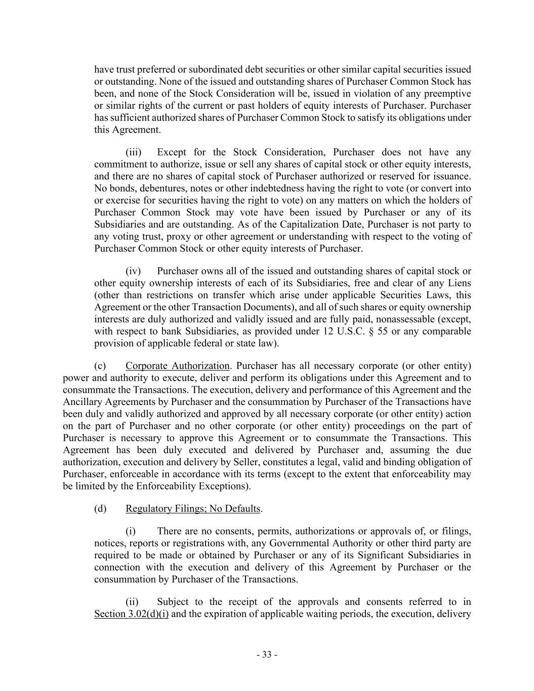 -33-有已发行或未发行的信托优先或次级债务证券或其他类似资本证券。买方普通股的已发行和已发行股份均未发生,且股票对价均不会发生违反买方当前或过去股权持有人的任何优先购买权或类似权利的情况。买方拥有足够的买方普通股授权股份,以履行其在本协议下的义务。(iii)除股份代价外,买方并无任何授权、发行或出售任何股本股份或其他股本权益的承诺,亦无任何买方授权或预留发行的股本股份。没有任何债券、债权证、票据或其他有权就买方普通股持有人可能投票的任何事项投票(或转换为或行使有权投票的证券)的债务已由买方或其任何子公司发行并未偿还。截至资本化日期,买方不是与买方普通股或买方其他股权的投票有关的任何有表决权的信托、代理或其他协议或谅解的一方。(iv)买方拥有其每个子公司的所有已发行和流通股本或其他股权所有权权益,没有任何留置权(根据适用的证券法、本协议或其他交易文件产生的转让限制除外),所有此类股份或股权所有权权益均获得正式授权和有效发行,并已全额支付,不可评估(就银行子公司而言,根据12 U.S.C. § 55或适用的联邦或州法律的任何类似规定除外)。(c)公司授权。买方拥有一切必要的公司(或其他实体)权力和权力,以执行、交付和履行其在本协议下的义务并完成交易。买方执行、交付和履行本协议及附属协议以及买方完成交易均已获得买方方面所有必要的公司(或其他实体)行动的正式有效授权和批准,买方方面没有任何其他公司(或其他实体)程序是批准本协议或完成交易所必需的。本协议已由买方正式签署和交付,并假定卖方给予适当授权、执行和交付,构成买方的一项合法、有效和具有约束力的义务,可根据其条款强制执行(可执行性可能受到可执行性例外情况限制的情况除外)。(d)监管备案;无违约。(i)买方或其任何重要附属公司无须就买方执行和交付本协议或买方完成交易作出或取得任何政府当局或其他第三方的同意、许可、授权或批准,或向其提交、通知、报告或登记。(ii)在收到第3.02(d)(i)条所提述的批准及同意及适用的等待期届满后,执行、交付