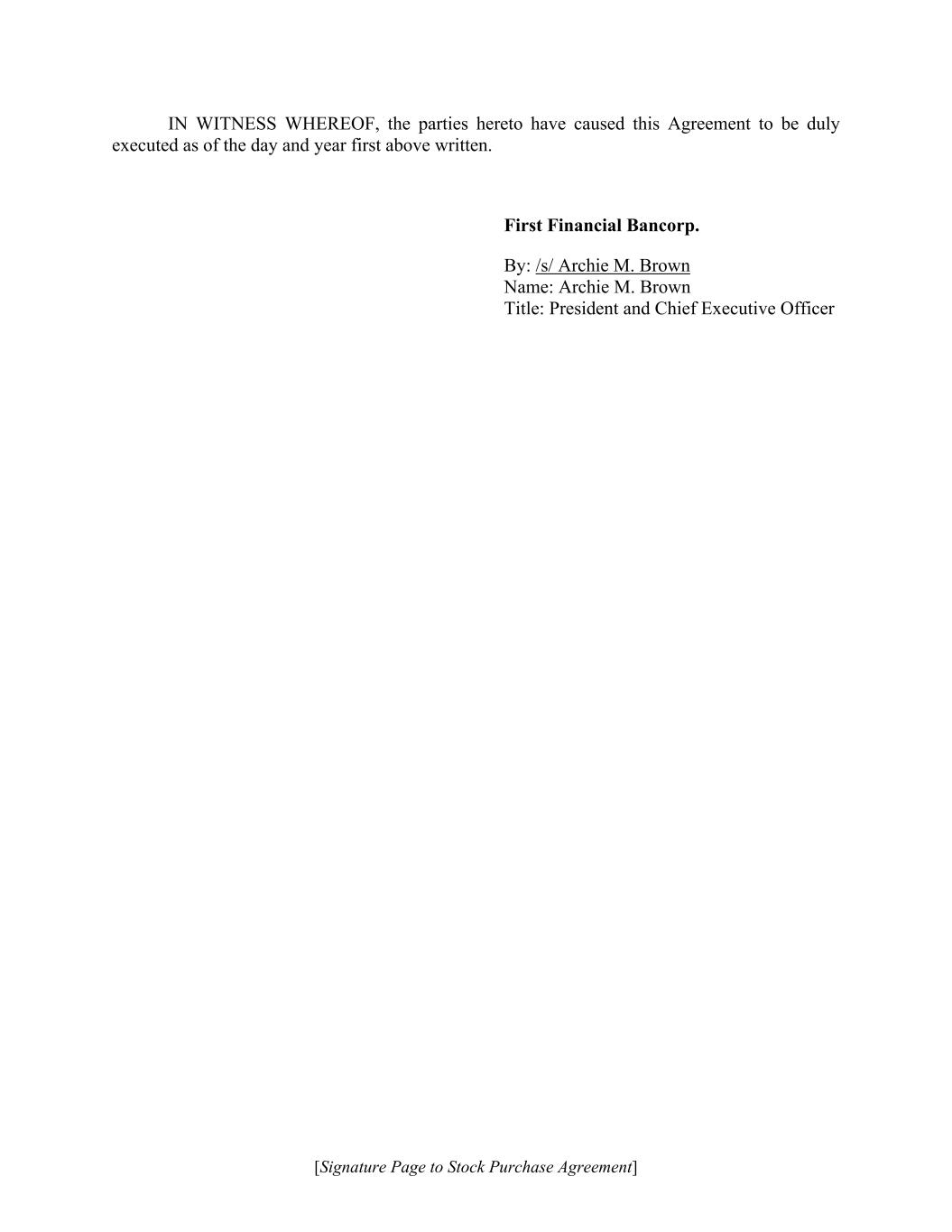 [股票购买协议签署页]作为证明,本协议各方已促使本协议自上述日期和年份之日起正式签署。第一金融银行股份By:/s/Archie M. Brown Name:Archie M. Brown Title:President and Chief Executive