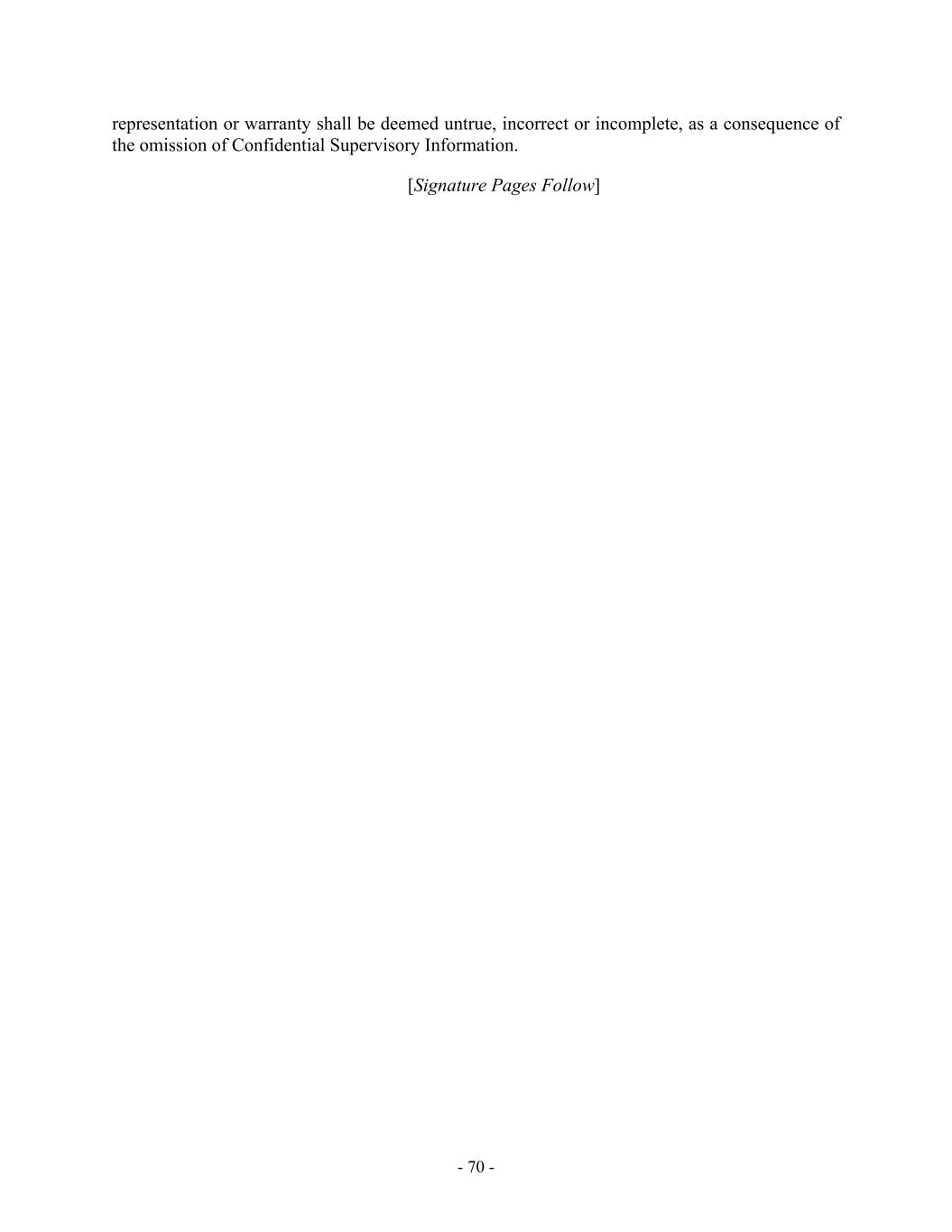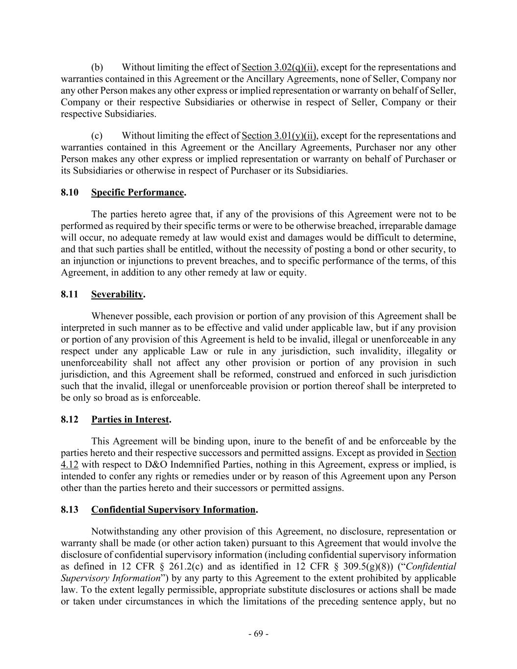 -69-(b)在不限制第3.02(q)(ii)条的效力的情况下,除本协议或附属协议所载的陈述和保证外,卖方、公司或任何其他人均不得代表卖方、公司或其各自的子公司或以其他方式就卖方、公司或其各自的子公司作出任何其他明示或默示的陈述或保证。(c)在不限制第3.01(y)(ii)条的效力的情况下,除本协议或附属协议所载的陈述和保证外,买方或任何其他人代表买方或其附属公司或以其他方式就买方或其附属公司作出任何其他明示或默示的陈述或保证。8.10具体表现。本协议各方同意,如果本协议的任何条款未按其特定条款的要求得到履行或以其他方式被违反,则将发生无法弥补的损害,在法律上不存在适当的补救措施,损害将难以确定,并且这些各方应有权在没有必要张贴保证金或其他担保的情况下,获得本协议的一项或多项禁令以防止违约,并有权具体履行本协议的条款,此外还有任何其他法律或股权上的补救措施。8.11可分割性。在可能的情况下,本协议任何条款的每一条款或部分应按适用法律规定的有效和有效的方式加以解释,但如果根据任何司法管辖区的任何适用法律或规则,本协议任何条款的任何条款或部分被认为在任何方面无效、非法或不可执行,则该无效、非法或不可执行不应影响该司法管辖区的任何其他条款或任何条款的部分,本协议应在该司法管辖区进行改革、解释和执行,以使无效的,非法或不可执行的规定或其部分,应被解释为仅具有可执行的宽泛范围。8.12利益相关方。本协议将对双方及其各自的继承人和允许的受让人具有约束力、对双方有利并可强制执行。除第4.12节中关于D & O受偿方的规定外,本协议中的任何明示或默示的内容均无意将本协议项下或因本协议原因的任何权利或补救办法授予除本协议各方及其继承人或许可转让人之外的任何人。8.13保密监管信息。尽管有本协议的任何其他规定,不得根据本协议作出任何披露、陈述或保证(或采取任何其他行动),其中将涉及本协议任何一方在适用法律禁止的范围内披露机密监管信息(包括12 CFR § 261.2(c)中定义的和12 CFR § 309.5(g)(8)中确定的机密监管信息)(“机密监管信息”)。在法律允许的范围内,在适用前句限制的情况下,应当作出或者采取适当的替代披露或者行动,但不得