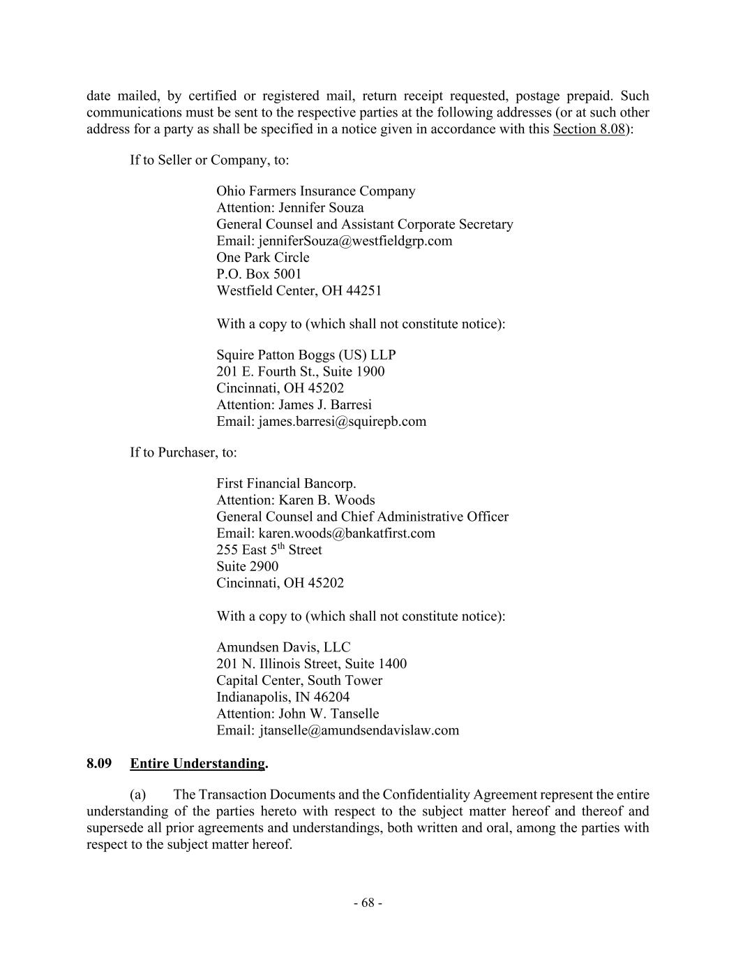 -68-日期邮寄,以挂证或挂号邮寄,要求回执,预付邮资。此类通信必须在以下地址(或在根据本第8.08条发出的通知中指定的一方当事人的其他地址)发送给各自当事人:如果发送给卖方或公司,则发送至:Ohio Farmers Insurance Company收件人:Jennifer Souza总法律顾问和助理公司秘书电子邮件:jenniferSouza@westfieldgrp.com One Park Circle P.O. Box 5001 Westfield Center,OH 44251并附一份(不构成通知):Squire Patton Boggs(US)LLP 201 E. Fourth St.,Suite 1900 Cincinnati,OH 45202收件人:James J. Barresi电子邮件:james.barresi@squirepb.com如果发送给买方,致:第一金融银行股份关注度:Karen B. Woods总法律顾问兼首席行政官邮箱:karen.woods@bankatfirst.com 255 East 5th Street Suite 2900 Cincinnati,OH 45202并复印至(不应构成通知):Amundsen Davis,LLC 201 N. Illinois Street,Suite 1400 Capital Center,South Tower Indianapolis,IN 46204关注度:John W. Tanselle邮箱:jtanselle@amundsendavislaw.com 8.09完全了解。(a)交易文件和保密协议代表本协议各方对本协议及其标的事项的全部理解,并取代各方先前就本协议标的事项达成的所有书面和口头协议和谅解。