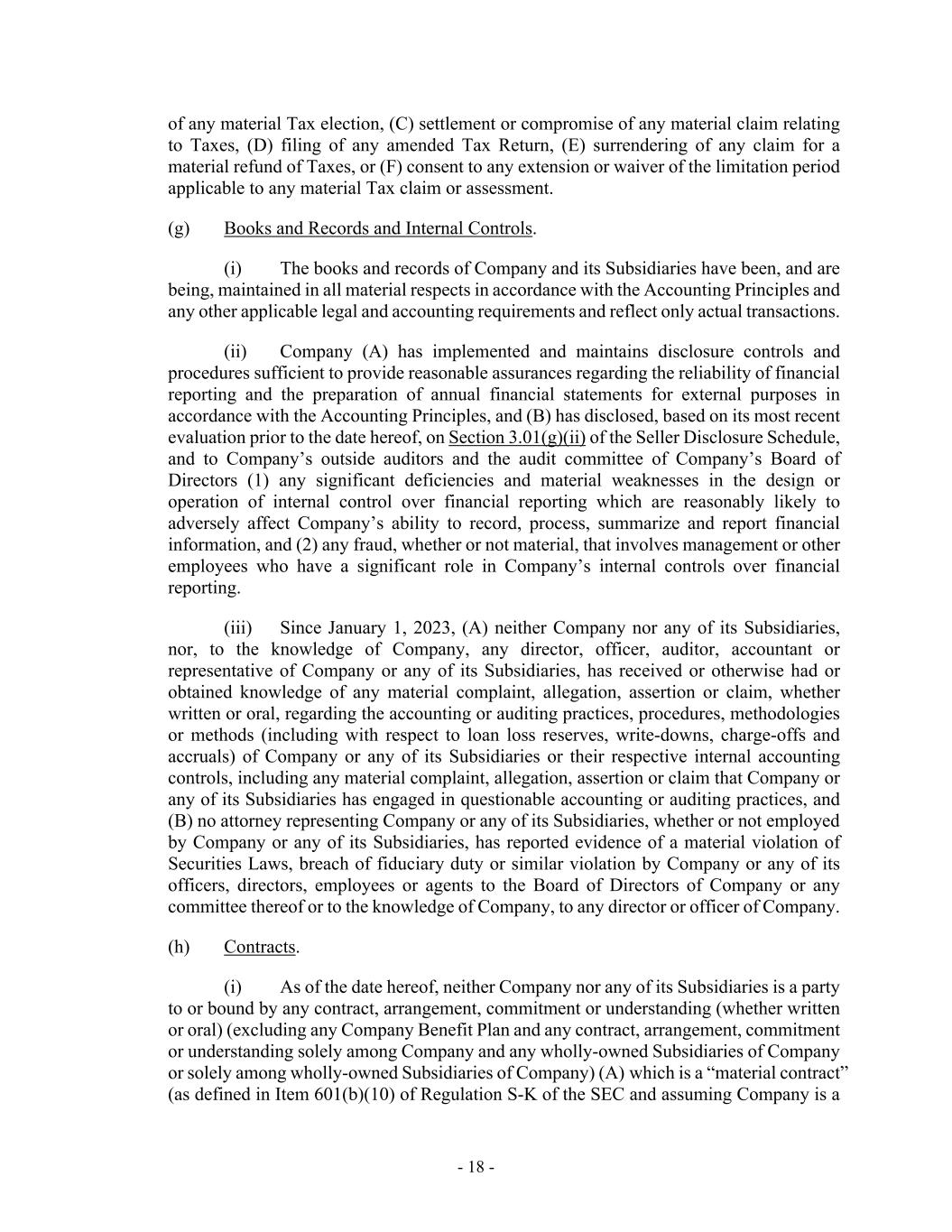 -18-任何重大税务选择,(c)解决或妥协任何与税务有关的重大索赔,(d)提交任何经修订的纳税申报表,(e)放弃任何重大退税索赔,或(f)同意任何延长或放弃适用于任何重大税务索赔或评估的时效期。(g)账簿和记录以及内部控制。(i)公司及其附属公司的簿册及纪录一直并正在根据会计原则及任何其他适用的法律及会计规定在所有重大方面维持,并仅反映实际交易。(ii)公司(a)已实施和维持披露控制和程序,足以就财务报告的可靠性和根据会计原则为外部目的编制年度财务报表提供合理保证,以及(b)已根据其在本协议日期之前的最近一次评估,根据卖方披露附表第3.01(g)(ii)节披露,以及向公司外部审计师和公司董事会审计委员会(1)财务报告内部控制的设计或操作中任何重大缺陷和重大缺陷,这些缺陷和重大缺陷合理地可能对公司记录、处理、汇总和报告财务信息的能力产生不利影响,以及(2)涉及管理层或在公司财务报告内部控制中具有重要作用的其他员工的任何欺诈行为,无论是否重大。(iii)自2023年1月1日起,(a)公司或其任何附属公司,或据公司所知,公司或其任何附属公司的任何董事、高级人员、核数师、会计师或代表,均未收到或以其他方式已或已知悉任何有关公司或其任何附属公司的会计或审计惯例、程序、方法或方法(包括有关贷款损失准备金、减记、冲销和应计)或其各自的内部会计控制的任何重大投诉、指控或索赔,包括任何重大投诉、指控,声称或声称公司或其任何子公司从事有问题的会计或审计做法,以及(b)没有代表公司或其任何子公司的律师,无论是否受雇于公司或其任何子公司,向公司董事会或其任何委员会或据公司所知,向公司的任何董事或高级职员报告公司或其任何高级职员严重违反证券法、违反信托义务或类似违规行为的证据。(h)合同。(i)截至本协议日期,公司或其任何附属公司均不是任何合同、安排、承诺或谅解(不论是书面或口头的)的一方或受其约束(不包括任何公司福利计划以及仅在公司与公司任何全资附属公司之间或仅在公司全资附属公司之间的任何合同、安排、承诺或谅解)(a)属于“重大合同”(定义见美国证券交易委员会S-K条例第601(b)(10)项,并假设公司为