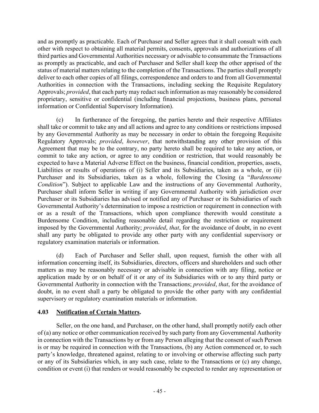 -45-并在切实可行的范围内尽快。买卖双方各自同意,应就获得所有第三方和政府当局为尽快完成交易所必需或可取的所有材料许可、同意、批准和授权相互协商,买卖双方应将与完成交易有关的重大事项的状态随时通知对方。各方应迅速向彼此交付与交易有关的所有政府当局的所有备案、通信和命令的副本,包括寻求必要的监管批准;但条件是,每一方可编辑合理地被视为专有、敏感或机密的信息(包括财务预测、商业计划、个人信息或机密监管信息)。(c)为促进上述规定,本协议各方及其各自的附属机构应采取或承诺采取任何和所有行动,并同意任何政府当局为获得上述必要的监管批准而施加的任何条件或限制;但条件是,尽管本协议的任何其他规定可能相反,本协议任何一方均不得被要求采取任何行动,或承诺采取任何行动,或同意任何条件或限制,合理预期会对交割后(i)卖方及其子公司作为一个整体,或(ii)买方及其子公司作为一个整体的业务、财务状况、财产、资产、负债或经营业绩产生重大不利影响(“负担条件”)。在符合适用法律和任何政府当局的指示的情况下,如果对买方或其子公司具有管辖权的任何政府当局已告知或通知任何买方或其子公司该政府当局决定对交易施加与交易有关或因交易而施加的限制或要求,买方应以书面通知卖方,一旦遵守该限制或要求将构成繁重的条件,包括有关政府当局施加的限制或要求的合理细节;但为免生疑问,在任何情况下,任何一方都没有义务向任何其他方提供任何保密的监督或监管审查材料或信息。(d)买方和卖方各自应根据要求向对方提供关于其本身、其子公司、董事、高级职员和股东的所有信息,以及与其或代表其或其任何子公司就交易向任何第三方或政府当局提出或向其提出的任何备案、通知或申请有关的合理必要或可取的其他事项;但为免生疑问,在任何情况下,一方均无义务向另一方提供任何保密的监督或监管审查材料或信息。4.03若干事项的通知。卖方和买方应迅速相互通知(a)该方从任何政府当局收到的与交易有关的任何通知或其他通信,由任何人或从任何人声称与交易有关需要或可能需要该人的同意,(b)已开始的任何诉讼,或据该方所知,对该方或其任何子公司构成威胁、有关或涉及或以其他方式影响的任何诉讼,而在任何此类情况下,与交易有关,或(c)任何变更,条件或事件(i)作出或会合理预期作出任何陈述或
