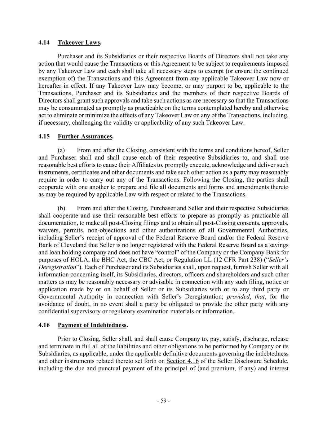 -59-4.14接管法律。买方及其子公司或其各自的董事会不得采取任何会导致交易或本协议受任何收购法律规定的要求约束的行动,且各自应采取一切必要步骤,以豁免(或确保继续豁免)交易和本协议不受现行或以后生效的任何适用的收购法律的约束。如任何收购法律可能成为或可能声称是适用于交易,买方及其附属公司及其各自董事会成员应给予必要的批准并采取必要的行动,以便交易可以在切实可行范围内尽快按照本协议所设想的条款完成,并以其他方式采取行动消除或尽量减少任何收购法律对任何交易的影响,包括在必要时对任何此类收购法律的有效性或适用性提出质疑。4.15进一步保证。(a)自交割之日起及之后,根据本协议的条款和条件,卖方和买方应并应促使其各自的子公司,并应尽合理的最大努力促使其关联公司迅速执行、确认和交付此类文书、证书和其他文件,并采取一方为进行任何交易而可能合理要求的其他行动。交割后,各方应相互合作,编制和归档适用法律可能要求的与交易相关或与交易相关的所有文件和表格及其修订。(b)自交割之日起及之后,买卖双方及其各自的子公司应进行合作,并尽其合理的最大努力,在切实可行的范围内尽快准备所有文件,进行所有交割后备案,并获得所有政府当局的所有交割后同意、批准、豁免、许可、无异议和其他授权,包括卖方收到美国联邦储备委员会和/或克利夫兰联邦储备银行的批准,即卖方不再作为储蓄和贷款控股公司在美国联邦储备委员会注册,并且就HOLA、《BHC法案》、《CBC法案》或《LL条例》(12 丨CFR第238部分)(“卖方注销注册”)而言,对公司或公司银行没有“控制权”。每一买方及其子公司均应根据要求向卖方提供关于其自身、其子公司、董事、高级职员和股东的所有信息以及与卖方或其子公司或其代表就卖方注销登记向或向任何第三方或政府当局提出的任何此类备案、通知或申请有关的合理必要或可取的其他事项;但为免生疑问,在任何情况下,一方均无义务向另一方提供任何保密的监督或监管审查材料或信息。4.16偿付债务。在交割前,卖方应并应促使公司全额支付、履行、解除、解除和终止公司或其子公司(如适用)根据卖方披露附表第4.16节规定的关于债务和其他相关文书的适用最终文件所需履行的所有责任和其他义务,包括到期和按时支付本金(以及溢价,如有)和利息