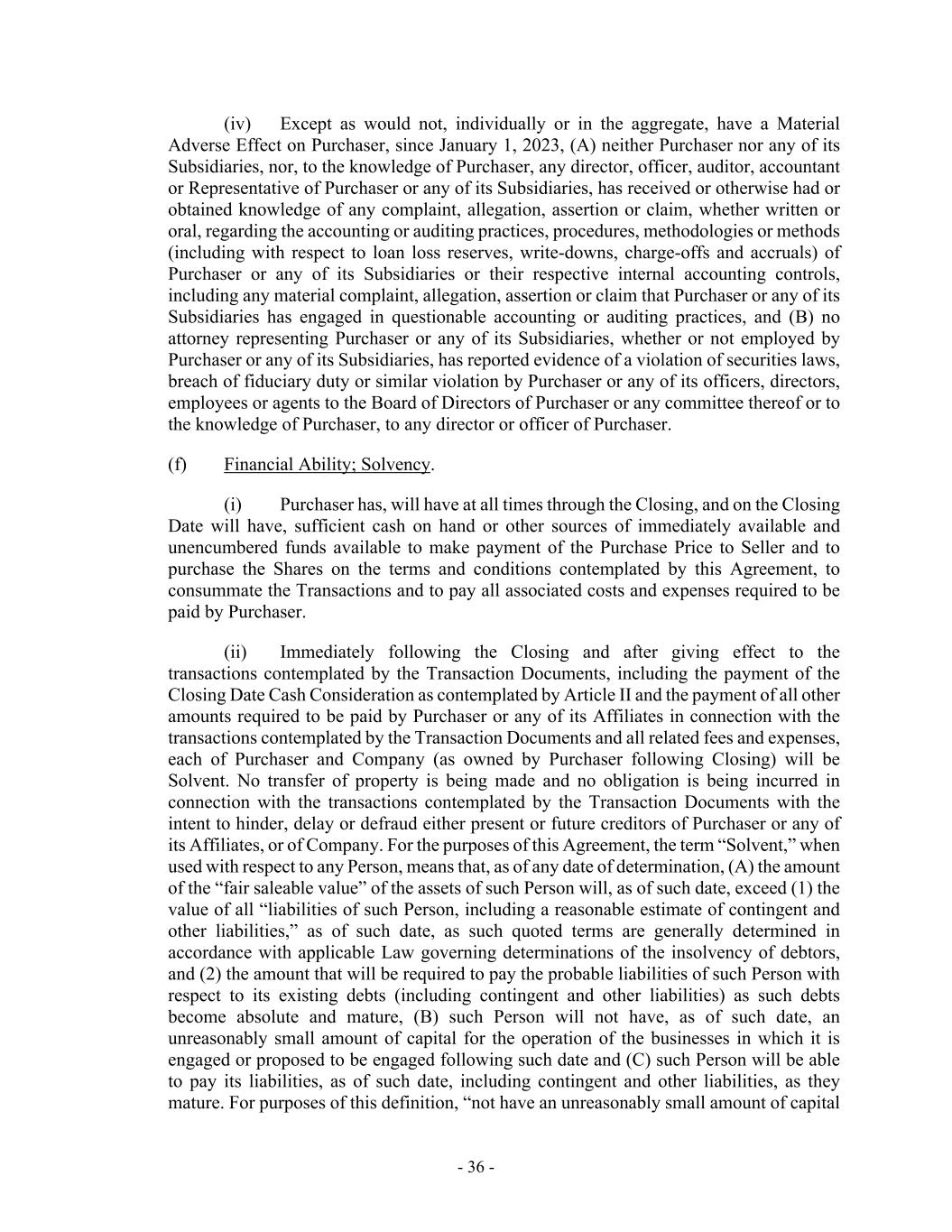 -36-(iv)除个别或总体上不会对买方产生重大不利影响外,自2023年1月1日起,(a)买方或其任何附属公司,或据买方所知,买方或其任何附属公司的任何董事、高级人员、审计师、会计师或代表,均未收到或以其他方式已经或获得关于会计或审计惯例、程序、方法或方法(包括关于贷款损失准备金、减记、买方或其任何子公司或其各自的内部会计控制的冲销和应计费用),包括买方或其任何子公司从事有问题的会计或审计做法的任何重大投诉、指控、断言或声称,以及(b)买方或其任何子公司的代理律师,无论是否受雇于买方或其任何子公司,均未报告买方或其任何高级职员、董事违反证券法、违反受托责任或类似违规行为的证据,买方董事会或其任何委员会的雇员或代理人或买方知悉的买方任何董事或高级人员。(f)财务Ability;偿债能力。(i)买方拥有、将在交割前的任何时候以及在交割日期将拥有足够的手头现金或其他可立即获得的未支配资金来源,以向卖方支付购买价款并按照本协议设想的条款和条件购买股份,以完成交易并支付买方需要支付的所有相关成本和费用。(ii)紧接交割后和交易文件所设想的交易生效后,包括支付第二条所设想的交割日期现金对价以及支付买方或其任何关联公司就交易文件所设想的交易所需支付的所有其他金额以及所有相关费用和开支,买方和公司(在交割后由买方拥有)各自将成为偿付能力。没有进行任何财产转移,也没有就交易文件所设想的交易承担任何义务,意图阻碍、延迟或欺骗买方或其任何关联公司或公司的现有或未来债权人。就本协议而言,就任何人而言,“溶剂”一词是指,截至任何确定日期,(a)截至该日期,该人资产的“公平可销售价值”的金额将超过(1)该人所有“负债的价值,包括对或有负债和其他负债的合理估计,”截至该日期,由于上述引述的条款一般是根据管辖债务人破产确定的适用法律确定的,且(2)在该等债务成为绝对和到期时,将需要支付该人就其现有债务(包括或有负债和其他负债)的可能负债的金额,(b)该人在该日期将没有,在该日期后为其所从事或拟从事的业务的运营提供不合理的少量资本,并且(c)该人将能够在该日期支付其负债,包括或有负债和其他负债到期时。就本定义而言,“不具有不合理的少量资本
