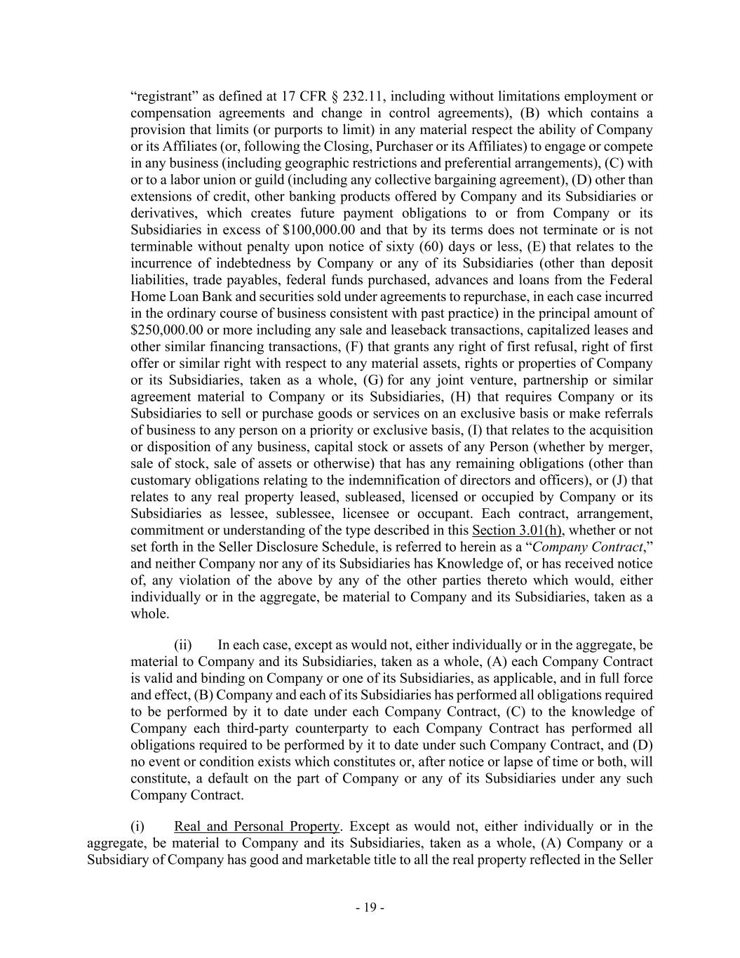 -19-17 CFR § 232.11定义的“注册人”,包括但不限于雇佣或补偿协议以及控制权协议的变更),(b)其中包含在任何重大方面限制(或旨在限制)公司或其关联公司(或在交割后买方或其关联公司)从事或竞争任何业务(包括地域限制和优惠安排)的能力的条款,(c)与工会或行会(包括任何集体谈判协议)或向工会或行会(包括任何集体谈判协议),(d)除信贷展期外,公司及其子公司提供的其他银行产品或衍生工具,这就产生了未来向公司或其子公司或从其子公司产生的超过100,000.00美元的付款义务,并且根据其条款,该义务不会在收到六十(60)天或更短时间的通知后终止或不会在没有罚款的情况下终止,(e)与公司或其任何子公司产生的债务(存款负债、贸易应付账款、购买的联邦基金、从联邦Home Loan银行获得的预付款和贷款以及根据回购协议出售的证券除外,在符合以往惯例的正常业务过程中发生的每一种情况下)本金金额为250,000.00美元或以上,包括任何售后回租交易、资本化租赁和其他类似融资交易,(f)就公司或其子公司的任何重大资产、权利或财产作为一个整体授予任何优先购买权、优先要约权或类似权利,(g)就任何合资企业、合伙企业或类似协议材料向公司或其子公司授予,(h)要求公司或其附属公司独家出售或购买商品或服务,或以优先权或排他性方式将业务转介予任何人,(i)与收购或处置任何人的任何业务、股本或资产(不论是通过合并、出售股票、出售资产或其他方式)有关但有任何剩余义务(与赔偿董事和高级职员有关的惯常义务除外),或(j)与公司或其附属公司作为承租人、转租、许可或占用的任何不动产有关,被许可人或居住者。本节3.01(h)中所述类型的每一份合同、安排、承诺或谅解,无论是否在卖方披露附表中列出,在此均称为“公司合同”,公司或其任何子公司均不知道或已收到其任何其他方违反上述规定的任何通知,这些违反将单独或总体上对公司及其子公司整体构成重大影响。(ii)在每宗个案中,除个别或整体而言对公司及其附属公司并不重要外,整体而言,(a)每份公司合约均有效,并对公司或其附属公司(如适用)具有约束力,并具有充分的效力,(b)公司及其附属公司已履行其根据每份公司合约迄今须履行的所有义务,(c)据公司所知,每份公司合同的每一第三方相对人已履行其迄今根据该公司合同须履行的所有义务,及(d)不存在构成或在通知或时间流逝后或两者兼而有之将构成公司或其任何附属公司在任何该公司合同下的违约的事件或条件。(i)不动产和个人财产。(a)公司或公司的附属公司对卖方所反映的所有不动产拥有良好和可销售的所有权,除非单独或合计对公司及其附属公司不具有重大意义,作为一个整体,(a)