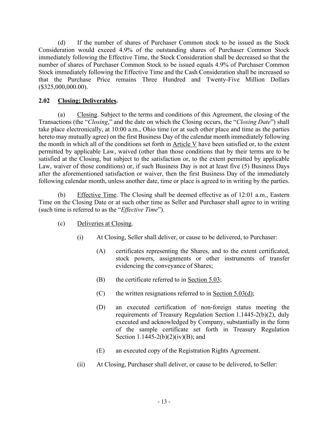 -13-(d)如果作为股票对价发行的买方普通股的股份数量将超过紧接生效时间后买方普通股已发行股份的4.9%,则应降低股票对价,使紧接生效时间后将发行的买方普通股的股份数量等于买方普通股的4.9%,并增加现金对价,使购买价格保持为三亿二千五百万美元(325,000,000.00美元)。2.02收盘;可交付成果。(a)结业。根据本协议的条款和条件,交易的结束(“结束,”和结束发生之日,“结束日期”)应在紧接第V条所列所有条件已得到满足或在适用法律允许的范围内被放弃(根据其条款将在结束时得到满足的条件除外,但须满足或在适用法律允许的范围内,豁免该等条件),或如该营业日不是在前述满足或豁免后至少五(5)个营业日,则为紧接下一个历月的第一个营业日,除非各方书面同意另一日期、时间或地点。(b)生效时间。截止日期自截止日期东部时间上午12:01或卖方和买方书面同意的其他时间(该时间称为“生效时间”)起视为生效。(c)收盘时交付。(i)在交割时,卖方应向买方交付或安排交付:(a)代表股份的证书,并在已证明的范围内,证明股份转让的股票权力、转让或其他转让文书;(b)第5.03条提及的证书;(c)第5.03(d)条提及的书面辞职;(d)符合库务署条例第1.1445-2(b)(2)条要求的非外国身份的已签立证明,由公司正式签立和承认,基本上以库务署条例第1.1445-2(b)(2)(iv)(b)条规定的样本证书的形式;(e)登记权协议的已签立副本。(ii)在交割时,买方应向卖方交付或安排交付: