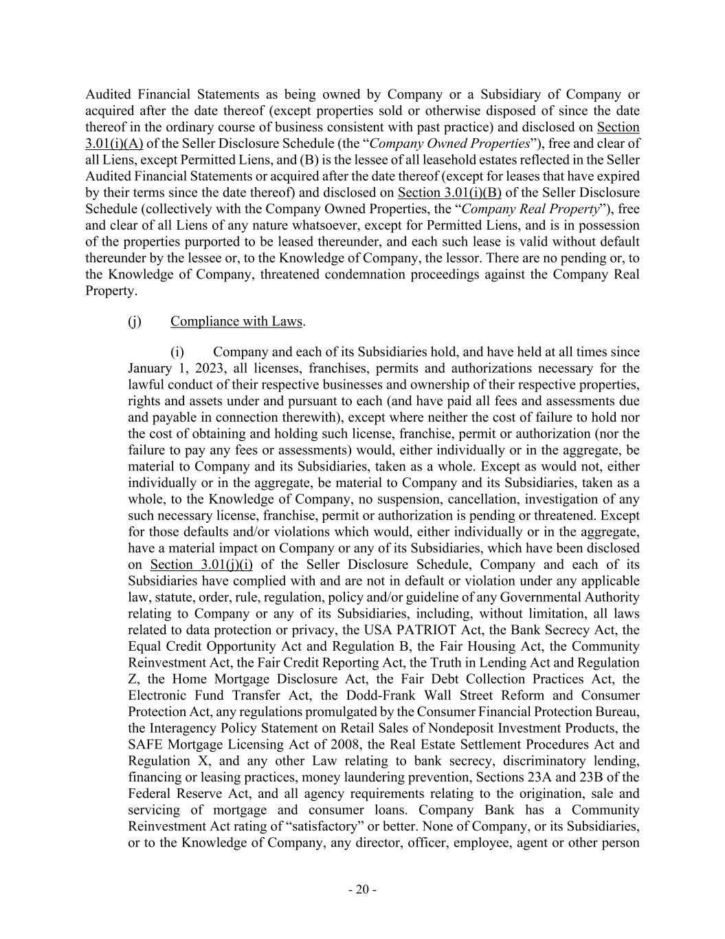 -20-经审计的财务报表为公司或公司的附属公司所拥有或在其日期之后取得(但自该日期起在符合以往惯例的正常业务过程中出售或以其他方式处置的财产除外),并根据卖方披露附表第3.01(i)(a)节披露(“公司拥有的财产”),不存在任何留置权,但允许的留置权除外,及(b)为卖方经审核财务报表所反映或于财务报表日期后取得的所有租赁财产的承租人(自财务报表日期起已按其条款届满的租赁除外),并根据卖方披露附表第3.01(i)(b)节披露(与公司拥有的财产统称为“公司不动产”),不受任何性质的任何留置权(许可留置权除外),并拥有根据该等财产看来是根据该等财产出租,而每项该等租赁在承租人根据该等财产下均属有效而无违约,或据公司所知,出租人。不存在针对公司不动产的未决或据公司所知的威胁谴责程序。(j)遵守法律。(i)公司及其各附属公司持有且自2023年1月1日以来一直持有合法开展其各自业务所需的所有执照、特许经营权、许可和授权,以及各自根据和依据各自持有的各自财产、权利和资产的所有权(并已支付与此相关的所有到期和应付的费用和评估),除非未能持有的成本或获得和持有该等执照、特许经营权、许可或授权的成本(或未能支付任何费用或评估)均不会单独或合计,对公司及其子公司构成重大影响,整体而言。除个别或整体而言对公司及其附属公司并不重要外,整体而言,据公司所知,没有任何暂停、取消、调查任何该等必要的许可、专营权、许可或授权是待决或威胁的。除已根据卖方披露附表第3.01(j)(i)节披露的个别或总体上会对公司或其任何子公司产生重大影响的违约和/或违规行为外,公司及其每一家子公司均已遵守且未违反与公司或其任何子公司有关的任何适用法律、法规、命令、规则、条例、政策和/或任何政府当局的指导方针,包括但不限于与数据保护或隐私相关的所有法律、《美国爱国者法》、《银行保密法》,平等信贷机会法和条例B、公平住房法、社区再投资法、公平信用报告法、贷款真相法和条例Z、住房抵押贷款披露法、公平债务催收惯例法、电子资金转移法、多德-弗兰克华尔街改革和消费者保护法、消费者金融保护局颁布的任何条例、非存款投资产品零售的机构间政策声明、2008年安全保障抵押贷款许可法、房地产结算程序法和条例X,以及与银行保密有关的任何其他法律,歧视性借贷、融资或租赁做法、防止洗钱、《联邦储备法》第23A和23B条,以及与抵押贷款和消费者贷款的发起、销售和服务有关的所有机构要求。Company Bank的社区再投资法案评级为“满意”或更好。公司或其附属公司,或据公司所知,任何董事、高级人员、雇员、代理人或其他人