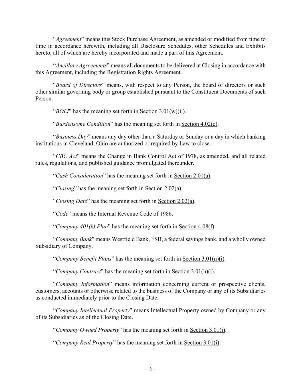 -2-“协议”是指根据本协议不时修订或修改的本股票购买协议,包括本协议的所有披露附表、其他附表和附件,所有这些均在此纳入并成为本协议的一部分。“附属协议”是指根据本协议在交割时交付的所有文件,包括注册权协议。“董事会”是指,就任何人而言,根据该人的组成文件成立的董事会或其他类似的理事机构或团体。“BOLI”具有第3.01(w)(ii)节规定的含义。“负担条件”具有第4.02(c)节规定的含义。“营业日”是指除周六或周日以外的任何一天,或俄亥俄州克利夫兰的银行机构获得法律授权或被要求关闭的一天。“CBC法案”是指经修订的1978年《银行管制法案》的变更,以及根据该法案颁布的所有相关规则、条例和已发布的指导意见。“现金对价”具有第2.01(a)节规定的含义。“结”具有第2.02(a)节规定的含义。“截止日期”具有第2.02(a)节规定的含义。“法典”是指1986年的《国内税收法典》。“公司401(k)计划”具有第4.08(f)节中规定的含义。“公司银行”是指Westfield Bank、FSB、联邦储蓄银行和Company的全资子公司。“公司福利计划”具有第3.01(n)(i)节中规定的含义。“公司合同”具有第3.01(h)(i)节规定的含义。“公司信息”是指有关当前或潜在客户、客户、账户或与公司或其任何子公司的业务有关的紧接截止日期之前进行的其他信息。“公司知识产权”是指公司或其任何子公司截至交割日所拥有的知识产权。“公司自有财产”具有第3.01(i)节中规定的含义。“公司不动产”具有第3.01(i)节规定的含义。