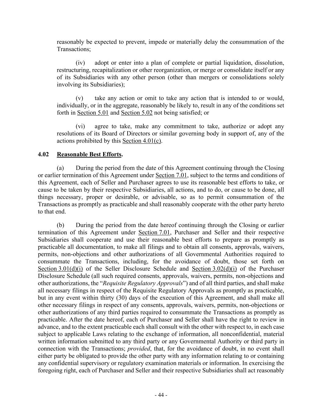 -44-合理预期会阻止、阻碍或实质上延迟交易的完成;(iv)采纳或订立全部或部分清算、解散、重组、资本重组或其他重组的计划,或将本身或其任何附属公司与任何其他人合并或合并(仅涉及其附属公司的合并或合并除外);(v)采取任何行动或不采取任何旨在或将单独或合计合理可能采取的行动,导致第5.01条和第5.02条规定的任何条件不被满足;或(vi)同意采取、作出任何承诺,采取、授权或通过其董事会或类似理事机构的任何决议,以支持本第4.01(c)条禁止的任何行动。4.02合理的最大努力。(a)在自本协议之日起至本协议根据第7.01条终止或提前终止之日止的期间内,在遵守本协议条款和条件的情况下,卖方和买方各自同意尽其合理的最大努力采取或促使其各自的子公司采取所有行动,并采取或促使采取所有必要、适当或可取或可取的事情,以便在切实可行的范围内尽快完成交易,并应为此目的与协议另一方合理合作。(b)自本协议之日起至本协议根据第7.01条终止或提前终止之日止的期间内,买卖双方及其各自的子公司应合作并尽其合理的最大努力,在切实可行的范围内尽快准备所有文件,提交所有文件并获得完成交易所需的所有政府当局的所有同意、批准、放弃、许可、不反对和其他授权,包括为免生疑问,卖方披露附表第3.01(d)(i)条和买方披露附表第3.02(d)(i)条规定的授权(所有这些必要的同意,批准、放弃、许可、无异议及其他授权,“必要的监管批准”)和所有第三方,并应在切实可行范围内尽快就必要的监管批准提交所有必要的备案,但无论如何应在本协议执行后三十(30)天内提交,并应在切实可行范围内尽快就完成交易所需的任何第三方的任何同意、批准、放弃、许可、无异议或其他授权提交所有其他必要的备案。在本协议日期之后,买卖双方均有权事先审查,并在切实可行的范围内各自就提交给任何第三方或任何政府当局或与交易有关的第三方的所有非机密、重要的书面信息(在每种情况下均须遵守与信息交换有关的适用法律)与对方协商;但为免生疑问,在任何情况下,任何一方均无义务向另一方提供任何与或包含任何机密监管或监管审查材料或信息有关的信息。买卖双方及其各自的子公司在行使前述权利时,应合理