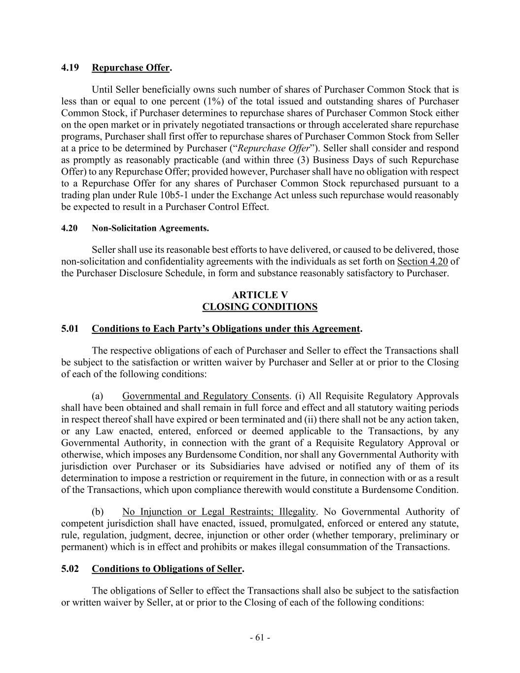 -61-4.19回购要约。在卖方实益拥有买方普通股的股份数量少于或等于买方普通股已发行和已发行股份总数的百分之一(1%)之前,如果买方决定在公开市场或私下协商交易中或通过加速股份回购计划回购买方普通股的股份,买方应首先以买方确定的价格向卖方提出回购买方普通股的股份(“回购要约”)。卖方应在合理可行的情况下(并在此种回购要约的三(3)个工作日内)尽快考虑并回应任何回购要约;但条件是,买方对根据《交易法》第10b5-1条规则下的交易计划回购的买方普通股的任何股份的回购要约没有义务,除非合理地预期这种回购会导致买方控制效应。4.20非征集协议。卖方应尽其合理的最大努力,以买方合理满意的形式和实质交付或促使交付买方披露附表第4.20节规定的与个人的非邀约和保密协议。第五条结束条件5.01各缔约方在本协议下的义务的条件。买卖双方各自实施交易的各自义务应以买卖双方在以下每一项条件结束时或之前达成或书面放弃为前提:(a)政府和监管同意。(i)所有必要的规管批准均应已获得,并应保持完全有效,与此有关的所有法定等待期均应已届满或终止;(ii)任何政府当局不得就授予必要的规管批准或其他方面采取任何行动,或制定、订立、执行或被视为适用于交易的任何法律,而该等行动或法律施加任何繁重的条件,对买方或其子公司具有管辖权的任何政府当局也不得告知或通知其中任何一方其决定在未来就交易或因交易而施加限制或要求,一旦遵守该限制或要求将构成负担条件。(b)没有禁令或法律限制;违法。任何有管辖权的政府当局均不得颁布、发布、颁布、执行或订立任何生效并禁止或非法完成交易的法规、规则、条例、判决、法令、强制令或其他命令(不论是临时、初步或永久的)。5.02卖方义务的条件。卖方实现交易的义务还应以卖方在以下每一项条件结束时或之前达成或书面放弃为前提: