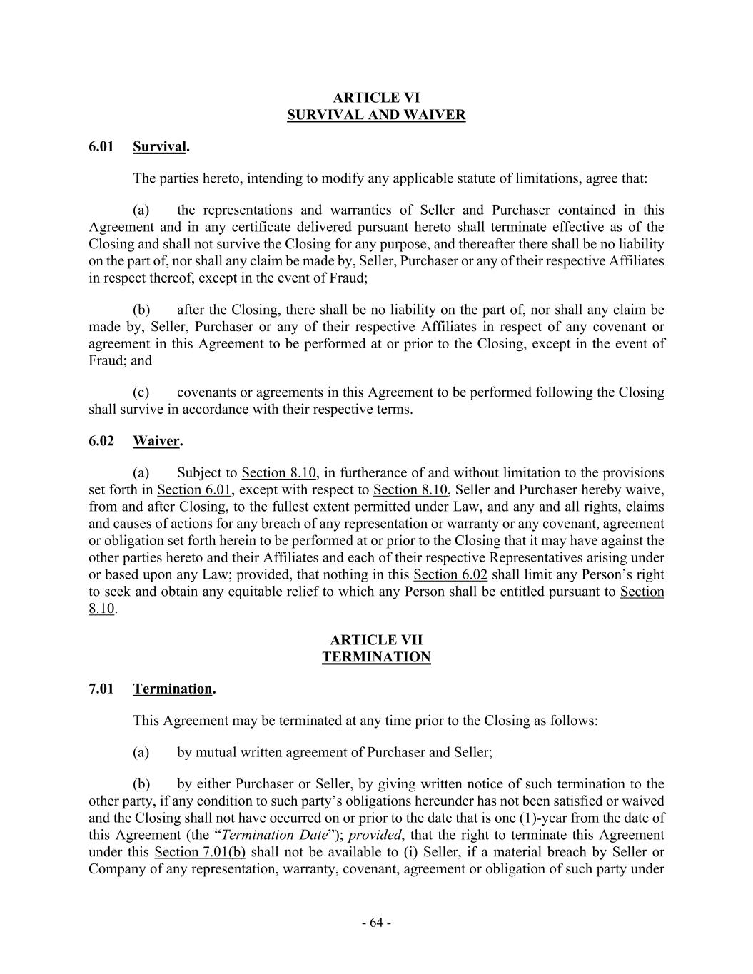 -64-第六条生存和放弃6.01生存。本协议各方有意修改任何适用的诉讼时效,同意:(a)本协议和依据本协议交付的任何证书中所载的卖方和买方的陈述和保证自交割时起终止生效,并且出于任何目的均不能在交割后继续有效,此后卖方、买方或其各自的任何关联公司对此不承担任何责任,也不应就此提出任何索赔,除非发生欺诈行为;(b)交割后,卖方和买方不承担任何责任,卖方、买方或其各自的任何关联公司也不得就本协议中将在交割时或之前履行的任何契诺或协议提出任何索赔,但发生欺诈的情况除外;以及(c)本协议中将在交割后履行的契诺或协议应根据其各自的条款继续有效。6.02豁免。(a)除第8.10条另有规定外,为促进并不限于第6.01条所列条文,除第8.10条外,卖方和买方特此在法律允许的最大范围内,自交割之日起及之后,放弃任何违反任何陈述或保证或任何契诺的任何和所有权利、索赔和诉讼因由,此处规定的在交割时或之前可能对根据或基于任何法律产生的其他各方及其关联公司和各自代表履行的协议或义务;但本第6.02条中的任何规定均不得限制任何人根据第8.10条寻求和获得任何人有权获得的任何衡平法救济的权利。第七条终止7.01终止。本协议可在结束前的任何时间按以下方式终止:(a)通过买卖双方的相互书面协议;(b)由买方或卖方中的任何一方,通过向另一方发出有关终止的书面通知,如果该一方在本协议项下的义务的任何条件尚未得到满足或放弃,并且结束不应发生在自本协议日期(“终止日期”)起一(1)年之日或之前;但,(i)如果卖方或公司严重违反该方根据本条例第7.01(b)条作出的任何陈述、保证、契诺、协议或义务,则根据本条例第7.01(b)条终止本协议的权利不应提供予卖方