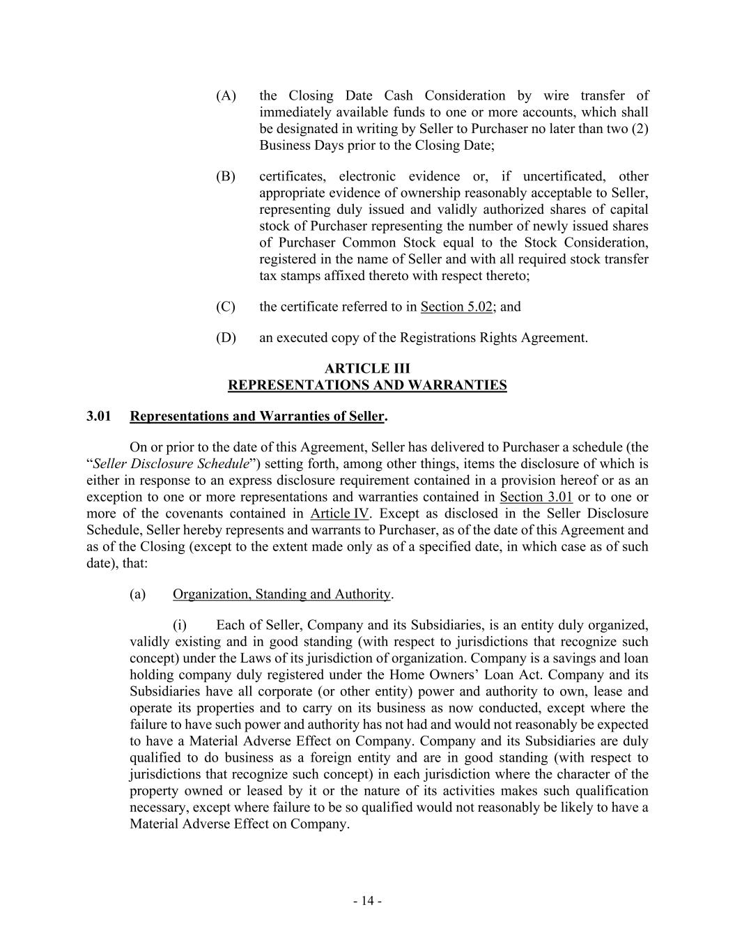 -14-(a)以电汇方式将即时可用资金汇入一个或多个账户的截止日期现金对价,卖方应在截止日期前两(2)个工作日内以书面指定该账户给买方;(b)证书、电子证据,或(如未经证明)卖方合理接受的其他适当所有权证据,代表买方正式发行和有效授权的股本股份,代表买方新发行的普通股股份数量等于股票对价,以卖方的名义注册,并附有与之相关的所有所需股票转让税票;(c)第5.02条所指的证书;及(d)注册权协议的签立副本。第三条代表和保证3.01卖方的代表和保证。在本协议日期当日或之前,卖方已向买方交付了一份附表(“卖方披露附表”),其中载列(其中包括)披露的项目,这些项目要么是为了响应本协议条款中所载的明确披露要求,要么是作为第3.01节中所载的一项或多项陈述和保证的例外,要么是第四条中所载的一项或多项契诺的例外。除卖方披露附表中披露的情况外,卖方特此向买方声明并保证,截至本协议日期和交割时(除非仅在特定日期作出,在这种情况下为该日期):(a)组织、地位和权威。(i)卖方、公司及其子公司中的每一个都是根据其组织管辖权的法律适当组织、有效存在并具有良好信誉(就承认这一概念的法域而言)的实体。Company是一家根据《房主贷款法》正式注册的储蓄和贷款控股公司。公司及其子公司拥有所有公司(或其他实体)的权力和授权,以拥有、租赁和经营其财产,并按目前的方式开展其业务,除非未能拥有此类权力和授权没有也不会合理地预期会对公司产生重大不利影响。公司及其子公司具有作为外国实体开展业务的适当资格,并在其拥有或租赁的财产的性质或其活动的性质使此种资格成为必要的每个司法管辖区(就承认此种概念的司法管辖区而言)具有良好的信誉,除非不具备此种资格不会合理地可能对公司产生重大不利影响。