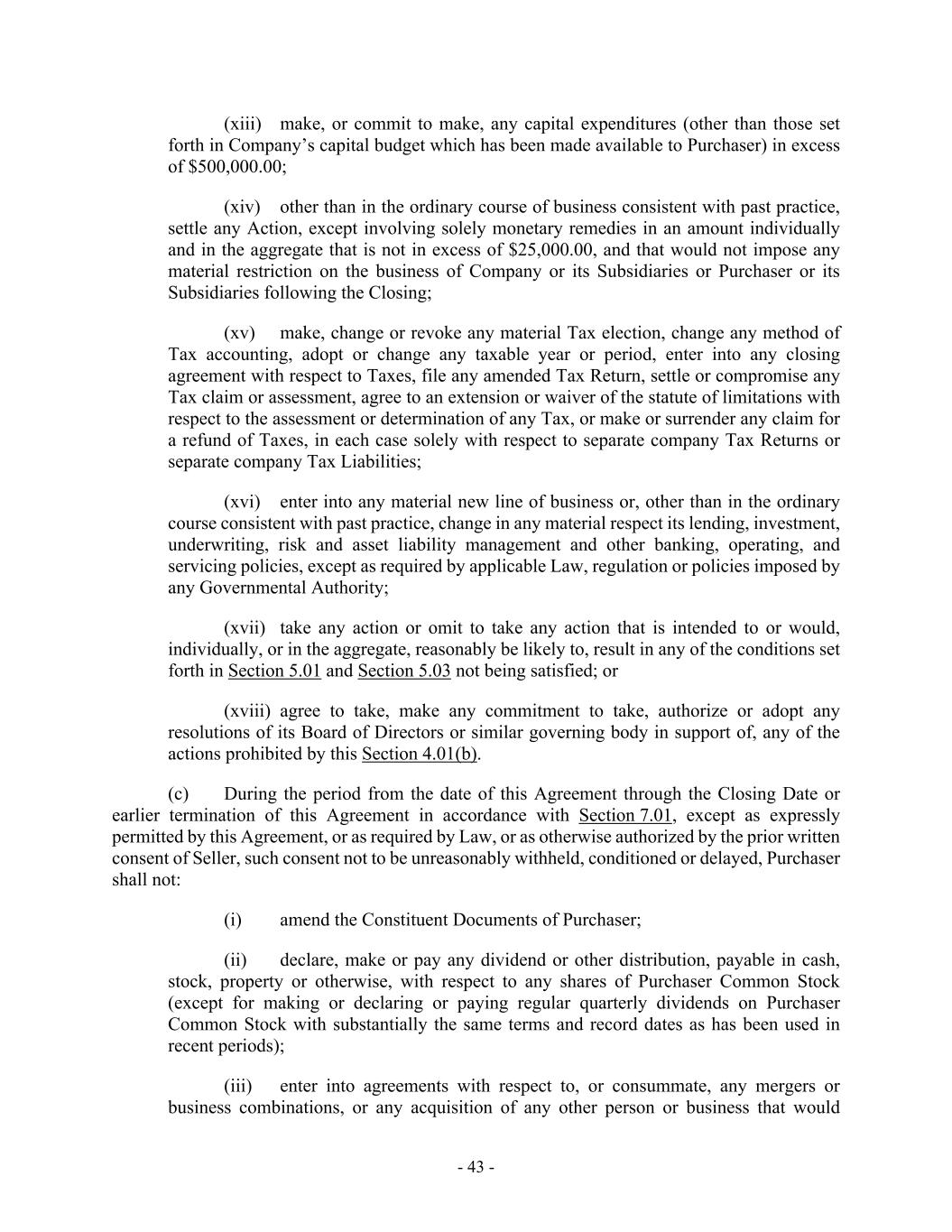 -43-(xiii)作出或承诺作出超过500,000.00美元的任何资本支出(公司资本预算中所列已提供给买方的资本支出除外);(xiv)除在符合以往惯例的正常业务过程中外,就任何诉讼达成和解,但仅涉及金额单独和总额不超过25,000.00美元的金钱补救措施,且在交割后不会对公司或其子公司或买方或其子公司的业务施加任何重大限制的除外;(xv)作出,更改或撤销任何重要的税务选择,更改任何税务会计方法,采纳或更改任何课税年度或期间,就税务订立任何结案协议,提交任何经修订的税务申报表,解决或妥协任何税务申索或评估,同意延长或放弃与任何税务评估或确定有关的诉讼时效,或提出或放弃任何退税要求,在每种情况下,仅就单独的公司纳税申报表或单独的公司税务负债而言;(xvi)订立任何重要的新业务范围,或除与过去惯例一致的正常过程外,在任何重大方面改变其贷款、投资、承销、风险和资产负债管理以及其他银行、经营和服务政策,但适用法律、法规或任何政府当局施加的政策要求除外;(xvii)采取任何行动或不采取任何旨在或将单独或总体上合理可能采取的行动,导致第5.01条和第5.03条规定的任何条件不被满足;或(xviii)同意采取、作出任何承诺,采取、授权或通过其董事会或类似理事机构的任何决议,以支持本第4.01(b)条禁止的任何行动。(c)在本协议日期至本协议截止日期或根据第7.01条提前终止的期间内,除非本协议明确许可,或法律要求,或经卖方事先书面同意另有授权,该同意不得被无理拒绝、附加条件或延迟,买方不得:(i)修订买方的组成文件;(ii)宣派、作出或支付任何股息或其他分派,以现金、股票、财产或其他方式支付,就买方普通股的任何股份而言(除非就买方普通股作出或宣布或支付定期季度股息,其条款和记录日期与最近几个时期所使用的条款和记录日期基本相同);(iii)就任何合并或企业合并或任何其他人或企业的任何收购订立协议或完成任何将