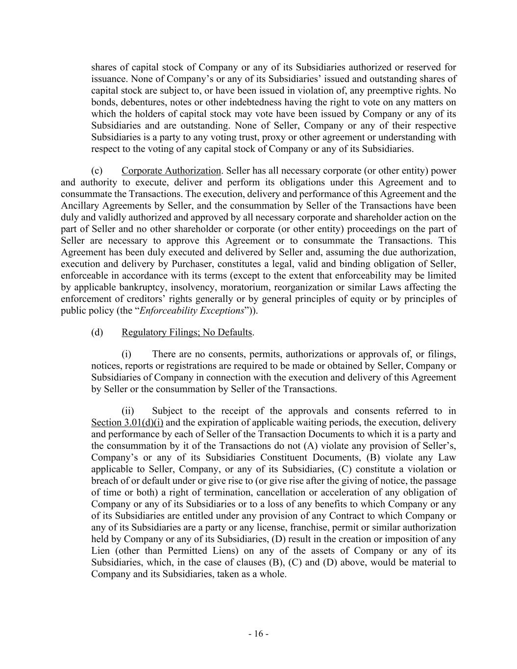 -16-公司或其任何附属公司获授权或预留发行的股本股份。本公司或其任何附属公司的已发行及发行在外的股本均不受任何优先认购权所规限或曾违反任何优先认购权。本公司或其任何附属公司均未发行任何债券、债权证、票据或其他有权就股本持有人可能投票的任何事项投票的债务。卖方、公司或其各自的任何子公司均不是与公司或其任何子公司的任何股本投票有关的任何投票信托、代理或其他协议或谅解的一方。(c)公司授权。卖方拥有所有必要的公司(或其他实体)权力和权力,以执行、交付和履行其在本协议下的义务并完成交易。卖方执行、交付和履行本协议及附属协议,以及卖方完成交易均已获得卖方方面所有必要的公司和股东行动的正式有效授权和批准,卖方方面无需进行任何其他股东或公司(或其他实体)程序来批准本协议或完成交易。本协议已由卖方正式签署和交付,并假定买方给予适当授权、执行和交付,构成卖方的一项合法、有效和具有约束力的义务,可根据其条款强制执行(除非可执行性可能受到适用的破产、无力偿债、暂停执行、重组或影响债权人权利强制执行的类似法律的一般限制,或受到一般公平原则或公共政策原则的限制(“可执行性例外”)。(d)监管备案;无(违约)。(i)卖方、公司或公司的子公司无须就卖方执行和交付本协议或卖方完成交易作出或取得同意、许可、授权或批准,或备案、通知、报告或登记。(ii)在收到第3.01(d)(i)节所述的批准和同意以及适用的等待期届满的情况下,卖方各自签署、交付和履行其作为一方当事人的交易文件以及由其完成交易并不(a)违反卖方、公司或其任何子公司组成文件的任何规定,(b)违反适用于卖方、公司或其任何子公司的任何法律,(c)构成违反、违反或失责,或导致(或在发出通知、时间流逝或两者兼而有之后)终止、取消或加速公司或其任何附属公司的任何义务的权利,或导致公司或其任何附属公司根据公司或其任何附属公司为一方的任何合同的任何条款或公司或其任何附属公司持有的任何许可证、专营权、许可证或类似授权而有权享有的任何利益的损失,(d)导致对公司或其任何附属公司的任何资产设定或施加任何留置权(许可留置权除外),而就上述(b)、(c)及(d)条而言,该留置权对公司及其附属公司整体而言将属重大。