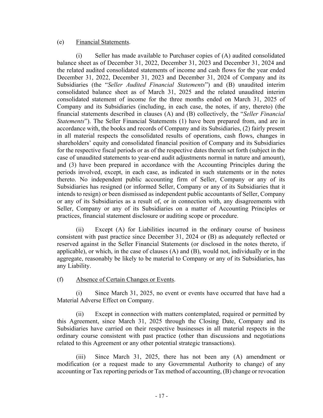 -17-(e)财务报表。(i)卖方已向买方提供(a)截至2022年12月31日、2023年12月31日及2024年12月31日的经审核综合资产负债表及公司及其附属公司截至2022年12月31日、2023年12月31日及2024年12月31日止年度的相关经审核综合收益及现金流量表(「卖方经审核财务报表」)及(b)截至2025年3月31日的未经审核中期综合资产负债表及公司及其附属公司截至2025年3月31日止三个月的相关未经审核中期综合收益表(包括,在每种情况下,其附注(如有)((a)和(b)条中描述的财务报表统称为“卖方财务报表”)。卖方财务报表(1)是根据公司及其附属公司的帐簿和记录编制的,并按照这些帐簿和记录编制,(2)在所有重大方面公允列报公司及其附属公司各自会计期间或截至其中所列各自日期的综合经营业绩、现金流量、股东权益变动和综合财务状况(在未经审计的报表的情况下,须按性质和金额正常的年终审计调整),以及(3)在所涉期间按照会计原则编制,但,在每种情况下,如该等声明或其附注所示。没有任何卖方、公司或其任何子公司的独立公共会计师事务所因与卖方、公司或其任何子公司在会计原则或惯例、财务报表披露或审计范围或程序事项上存在分歧或与此有关而辞职(或告知卖方、公司或其任何子公司其打算辞职)或被解雇为卖方、公司或其任何子公司的独立公共会计师。(ii)除(a)自2024年12月31日以来按照以往惯例在正常业务过程中产生的负债或(b)在卖方财务报表(或如适用,在其附注中披露)中充分反映或保留的负债外,或在(a)和(b)条的情况下,对公司或其任何子公司而言,单独或合计不会合理地相当可能具有重大意义的负债,不承担任何责任。(f)不存在某些变化或事件。(i)自2025年3月31日以来,未发生对公司产生重大不利影响的事件或事项。(二)除与本协议所设想、要求或允许的事项有关外,自2025年3月31日至截止日期,公司及其子公司在所有重大方面均按照以往惯例在正常过程中开展各自的业务(与本协议或任何其他潜在战略交易有关的讨论和谈判除外)。(iii)自2025年3月31日以来,没有任何(a)修订或修改(或要求任何政府当局更改)任何会计或税务报告期间或税务会计方法,(b)更改或撤销