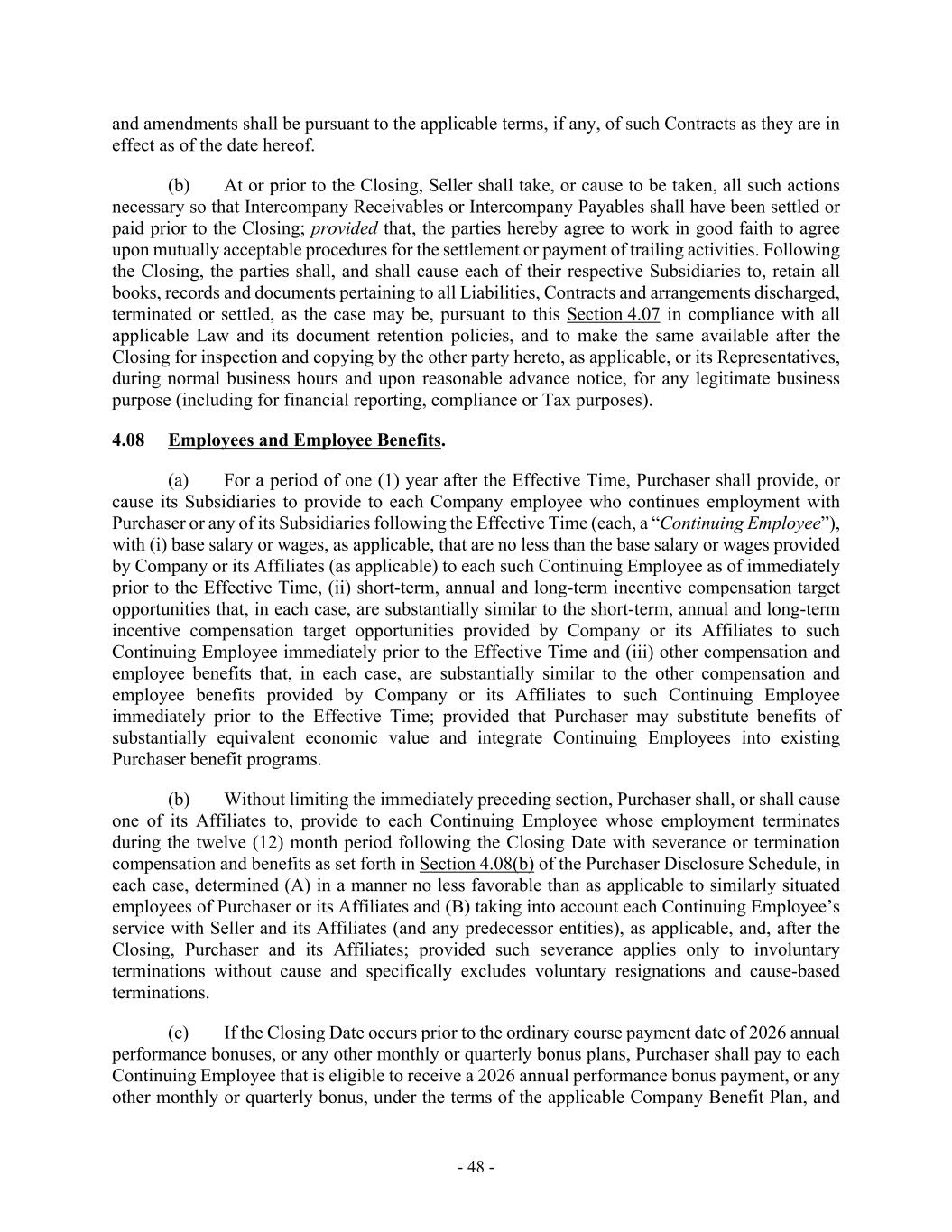 -48-并且修订应根据此类合同的适用条款(如果有的话),因为它们在本合同日期生效。(b)在交割时或交割前,卖方应采取或促使采取所有必要的此类行动,以便公司间应收款或公司间应付款项应已在交割前结清或支付;但条件是,各方在此同意本着诚意就尾随活动的结算或支付商定双方可接受的程序。在交割后,各方应并应促使其各自的子公司保留与所有负债、合同和安排解除、终止或结算(视情况而定)有关的所有簿册、记录和文件,以符合所有适用法律及其文件保留政策,并在交割后提供这些簿册、记录和文件,供合同另一方(如适用)或其代表在正常营业时间内并在合理提前通知后,出于任何合法业务目的(包括财务报告、合规或税务目的)查阅和复制。4.08雇员和雇员福利。(a)在生效时间后一(1)年的期间内,买方应向或促使其子公司向在生效时间后继续受雇于买方或其任何子公司的每一名公司雇员(每一名,“持续雇员”)提供(i)基本工资或工资(如适用),该基本工资或工资不低于公司或其关联公司(如适用)在紧接生效时间之前向每名该等持续雇员提供的基本工资或工资,(ii)短期、年度和长期激励薪酬目标机会,在每种情况下,与公司或其关联公司在紧接生效时间之前向该持续雇员提供的短期、年度和长期激励薪酬目标机会基本相似,以及(iii)在每种情况下与公司或其关联公司在紧接生效时间之前向该持续雇员提供的其他薪酬和雇员福利基本相似的其他薪酬和雇员福利;前提是买方可以替代经济价值基本相等的福利,并将持续雇员纳入现有的买方福利计划。(b)在不限制紧接前一节的情况下,买方应或应促使其关联公司之一向其雇佣在截止日期后十二(12)个月期间终止的每名持续雇员提供《买方披露附表》第4.08(b)节中规定的遣散费或解雇补偿金和福利,在每种情况下,确定(a)的方式不低于适用于买方或其关联公司类似情况的雇员,以及(b)考虑到每名持续雇员在卖方及其关联公司(以及任何前身实体)的服务(如适用),以及,交割后,买方及其关联公司;前提是此类遣散仅适用于无故的非自愿终止,具体不包括自愿辞职和基于原因的终止。(c)如果截止日期发生在2026年年度绩效奖金或任何其他月度或季度奖金计划的普通课程支付日期之前,买方应根据适用的公司福利计划的条款向有资格获得2026年年度绩效奖金或任何其他月度或季度奖金的每名持续雇员支付,并且