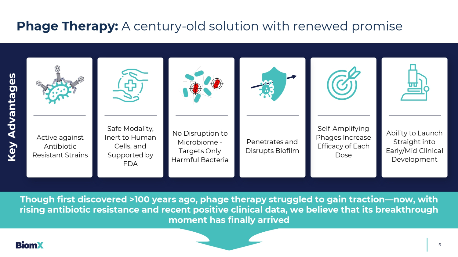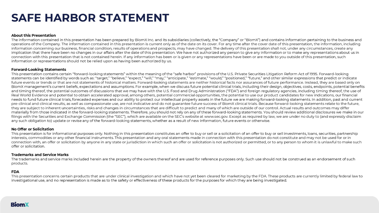 关于本演示文稿的安全港声明本演示文稿中包含的信息由BiomX Inc.及其子公司(统称“公司”或“BiomX”)编制,其中包含与公司业务和运营相关的信息。本演示文稿中包含的信息仅为截至封面日期的最新信息。对于本演示文稿涵盖日期之后的Y T IM,信息,包括有关我们的业务、财务状况、经营业绩和前景的信息,可能已经发生变化。在任何情况下,本演示文稿的交付不得产生任何暗示,即在本演示文稿日期之后我们的事务没有任何变化。我们没有授权任何PE RSO n就本演示文稿提供任何信息或对我们作出任何此处未包含的陈述。如果在本演示文稿之外已经或正在提供任何信息或已经或正在向您作出任何陈述,则不应依赖此类信息或陈述已获得我们的授权。前瞻性陈述本演示文稿包含1995年美国P Rivate证券诉讼改革法案“安全港”条款含义内的某些“前瞻性陈述”。前瞻性陈述可以通过以下词语来识别:“目标”、“相信”、“预期”、“将”、“可能”、“预期”、“估计”、“将”、“定位”、“未来”,以及其他预测或指示未来事件或趋势或不是历史事件陈述的类似表述。前瞻性陈述既不是历史事实,也不是对未来业绩的保证。相反,它们仅基于BiomX管理层当前的信念、期望和假设。例如,当我们讨论未来潜在的临床试验时,在cl uding他们的设计、目标、成本、终点、潜在的好处和时机,我们可能与美国食品和药物管理局(“FDA”)和外国监管机构讨论的潜在结果,包括时间安排、使用真实世界的证据和获得加速批准的潜力,除其他外,潜在的商业机会、将我们的产品候选者用于新适应症的潜力、我们为未来临床试验提供资金的财务需求,预测费用和我们在未来保护知识产权资产的能力,我们正在做出前瞻性陈述。此外,过去和现在的临床前和临床结果,以及同情使用,都不是指示性的,也不能保证BiomX临床试验未来的成功。由于前瞻性陈述与未来相关,它们受到固有的不确定性、风险和难以预测的环境变化的影响,其中许多都超出了我们的控制范围。实际结果和结果可能与前瞻性陈述中指出的存在重大差异。因此,你不应该依赖这些前瞻性的g语句中的任何一个。您应该查看我们在提交给美国证券交易委员会(“SEC”)的文件中所做的额外披露,这些文件可在SEC网站www.sec.gov上查阅。Exc ept根据法律要求,我们没有义务(并明确否认有任何此类义务)更新或修改任何前瞻性陈述,无论是由于新信息、未来的电子通风口或其他原因。没有要约或邀请本演示文稿仅供参考。本演示文稿中的任何内容均不构成购买或出售要约或对购买或出售投资、贷款、证券、合伙权益、商品或任何其他金融工具的要约的引用。本演示文稿和就本演示文稿所作的任何口头陈述不构成也不得用于或与此相关的任何国家或司法管辖区的任何人的要约或招揽,在该国家或司法管辖区,此类要约或招揽未获授权或许可,或向向向其提出此类要约或招揽是非法的任何人。商标和服务标记此处包含的商标和服务标记是其所有者的财产,仅供参考之用。这种使用不应被解释为对这类产品的认可。FDA本次演示涉及某些正在临床研究中且尚未被FDA批准用于mar ket ing的产品。这些产品目前受联邦法律限制为调查用途,对于这些产品的安全性或有效性,不作任何陈述,以用于他们正在接受调查的目的。