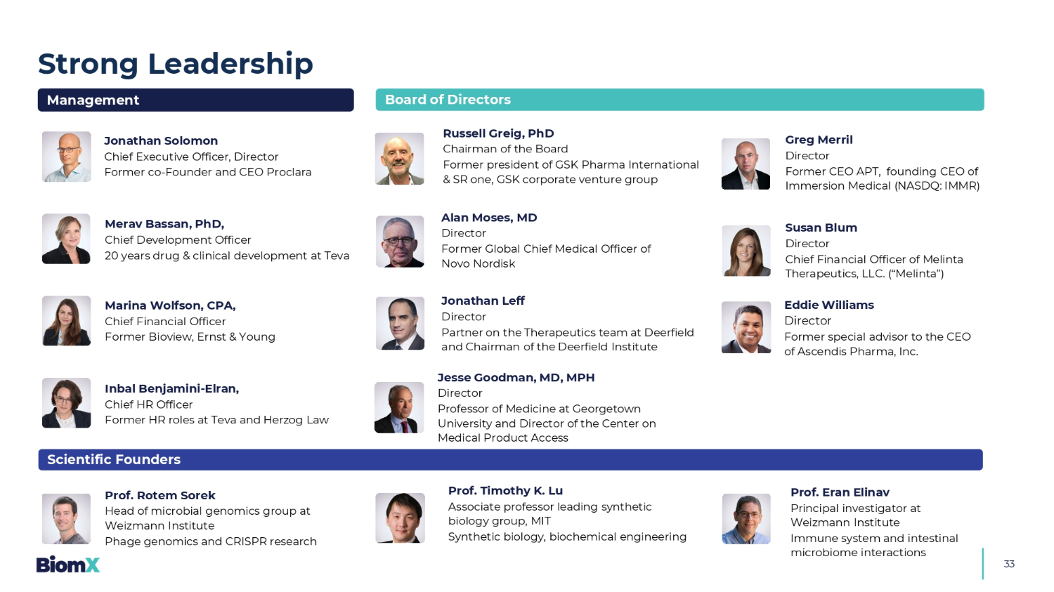 强有力的领导力33 Jonathan Solomon首席执行官、董事前联合创始人兼首席执行官Proclara Management丨梅拉夫·巴桑Merav Bassan,博士,首席开发官,梯瓦公司20年药物和临床开发首席财务官,注册会计师,TERM3前Bioview,安永Inbal Benjamini-Elran,首席人力资源官Teva和Herzog Law Scientific创始人董事会前人力资源职务Prof. Rotem Sorek魏茨曼研究所微生物基因组组组长噬菌体基因组学和CRISPR研究Prof. Eran Elinav魏茨曼研究所免疫系统和肠道微生物组相互作用首席研究员Prof. Timothy K. Lu麻省理工学院合成生物学、生物化学工程领导合成生物学小组副教授Russell Greig,博士董事会主席GSK Pharma International & SR One前总裁,GSK企业风险集团Alan Moses,MD董事诺和诺德前全球首席医疗官Jonathan Leff Deerfield治疗团队董事合伙人、Deerfield研究所主席Jesse GoodmanTERM1,医学博士,乔治城大学MPH医学主任教授和医疗产品准入中心主任Greg Merril董事APT前首席执行官,浸入科技 Medical(NASDQ:IMMR)创始首席执行官Susan Blum Melinta Therapeutics,LLC董事首席财务官。(“Melinta”)Eddie Williams董事Ascendis制药制药公司首席执行官前特别顾问。