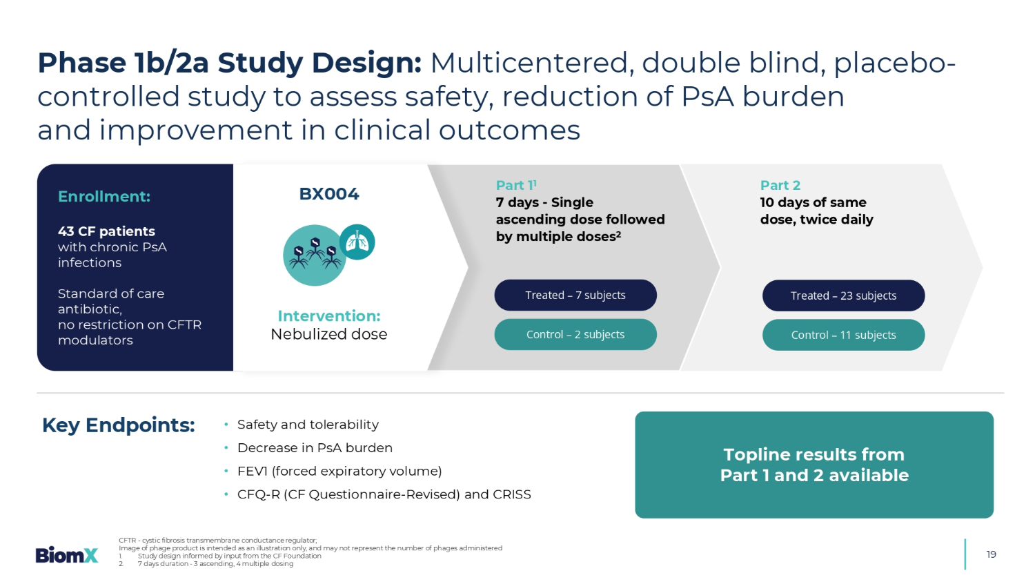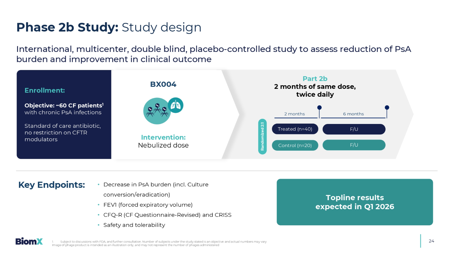 24 •降低PSA负担(包括。培养转化/根除)• FEV1(强制呼气量)• CFQ-R(CF问卷-修订)和CRISS •安全性和耐受性关键终点:E入组:目标:~60例CF患者1伴有慢性PSA感染标准护理抗生素,不限制CFTR调节剂BX004治疗(n = 40)对照(n = 20)随机2:1 2个月6个月F/U F/U国际、多中心、双盲、安慰剂对照研究,评估PSA负担减轻和临床结果改善干预:雾化剂量第2b部分2个月相同剂量,预计2026年第一季度的每日两次顶线结果2b期研究:研究设计1。有待与FDA讨论,并进一步磋商。所述研究中的受试者数量是一个目标,Actu al数可能会有所不同噬菌体产物的图像仅用作说明,可能并不代表施用的噬菌体数量
