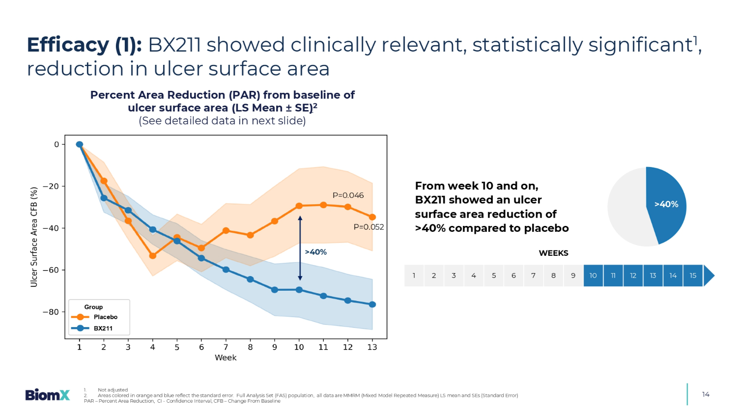 溃疡表面积基线面积减少14%(PAR)(LS均值± SE)1(详见下一张幻灯片的详细数据)BX211组安慰剂> 40% p = 0.052 p = 0.046从第10周及以后,BX211与安慰剂相比显示溃疡表面积减少> 40%周151413121110987654321 > 40%疗效(1):BX211显示出临床相关、具有统计学意义的2、溃疡表面积减少1。橙色和蓝色颜色的区域反映了标准误差。全分析集(FAS)总体,所有数据均为MMRM(混合模式l重复测量)LS均值和SEs(标准误差)2。未调整PAR –百分比面积减少,CI-置信区间,CFB –从基线变化