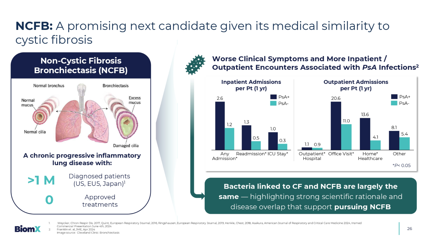 26 NCFB:鉴于其与囊性纤维化1的医学相似性,有望成为下一个候选者。.Weycker,Chron Respir DIS。2017,Quint,European Respiratory Journal,2016,Ringshausen,European Respiratory Journal,2019,Henkle,Chest,2018,Asakura,American Journal of Respiratory and Critical Care Medicine 2024,Insmed商业演示文稿2024年6月4日2。Franklin et. al,JME,Apr 2024图片来源:Cleveland Clinic:Bronchiecatasis > 1 m a慢性进行性炎症性肺病with:0 diagnosed patients(US,EU5,日本)1项获批准的治疗非囊性纤维化支气管扩张症(NCFB)临床症状恶化和更多与PSA感染相关的住院/门诊遭遇22.6 1.3 1.0 1.2 0.5 0.3任何入院*重新接纳*ICU入住*1.12 0.61 3.68.1 0.91 1.0 4.15.4门诊*医院办公室访问*首页*医疗保健每PT(1年)的其他住院患者入院人数每PT(1年)与CF和NCFB相关的细菌基本上是相同的——突出了支持追求NCFB的强有力的科学理由和疾病重叠*P < 0.05PSA + PSA-PSA + PSA-