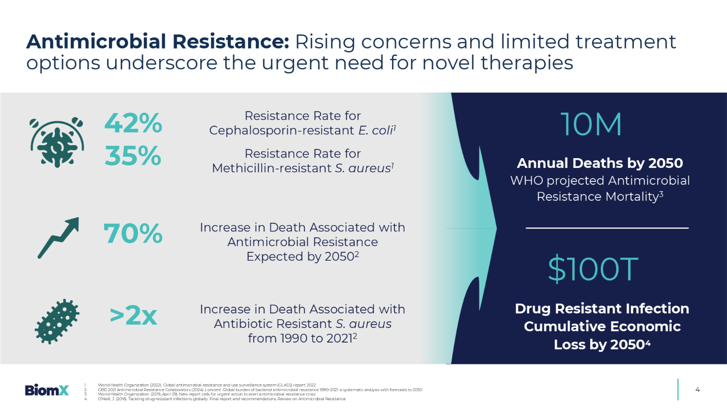 4到2050年每年有1000万人死亡世卫组织预测抗菌素耐药性死亡率3到2050年100T美元的耐药感染累积经济损失41。世界卫生组织(2022)。全球抗菌素耐药性和使用监测系统(GLASS)报告:2022年。2.GBD2021年抗菌素耐药合作者(2024年)。兰森特。全球细菌抗菌素耐药性负担1990 – 2021:系统分析,预测到2050年3。世界卫生组织。(2019年4月29日)。新报告呼吁采取紧急行动,避免抗菌素耐药性危机4。O'Neill,J.(2016)。全球应对耐药性感染:最终报告和建议。抗菌素耐药性审查& UHDWHG E \ 0DUWLQV 5DWNXV IURP WKH 1RXQ 3URMHFW 70% > 2x 42% 35%与抗菌素耐药性相关的死亡增加预计到2050年2与抗生素耐药性金黄色葡萄球菌相关的死亡增加1990-2021年2对头孢菌素耐药大肠杆菌的耐药率1对甲氧西林耐药金黄色葡萄球菌的耐药率1抗菌素耐药性:日益增加的担忧和有限的治疗选择凸显了对新疗法的迫切需求& UHDWHG E \$ QGUH % XDQG IURP WKH 1RXQ 3URMHFW