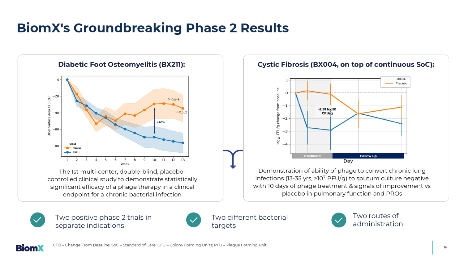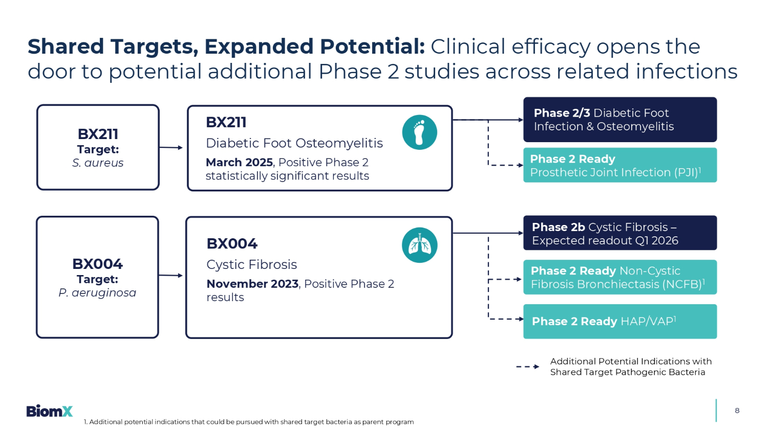 8个额外潜在适应症与共享靶点致病菌BX004囊性纤维化2023年11月,阳性2期结果BX211糖尿病足骨髓炎2025年3月,阳性2期统计学显着结果BX211靶点:金黄色葡萄球菌BX004靶点:铜绿假单胞菌2b期囊性纤维化–预期读数2026年第一季度第2期准备就绪非囊性纤维化支气管扩张(NCFB)1 2期准备就绪HAP/VAP 1期2/3期糖尿病足感染和骨髓炎2期准备就绪假体关节感染(PJI)1个共享靶点,扩大潜力:临床疗效为跨相关感染的潜在额外2期研究打开大门1。可以使用共享目标细菌作为亲本程序追求的其他潜在适应症