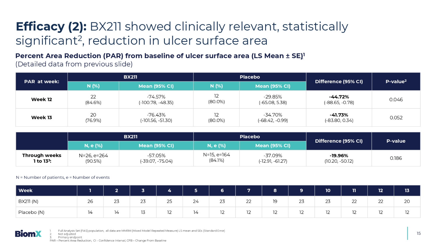 溃疡表面积(LS均值± SE)1(上一张幻灯片的详细数据)P-值2差(95% CI)安慰剂BX211周PAR:均值(95% CI)N(%)均值(95% CI)N(%)0.046-44.72%(-88.65,-0.78)-29.85%(-65.08,5.38)12(80.0%)-74.57%(-100.78,-48.35)22(84.6%)第12周0.052-41.73%(-83.80,0.34)-34.70%(-68.42,-0.99)12(80.0%)-76.43%(-101.56,-51.30)20(76.9%)第13周P-值差(95% CI)安慰剂BX211均值(95% CI)N,e(%)均值(95% CI)N,e(%)0.186-19.96%(10.20,-50.12)-37.09%(-12.91,-61.27)N = 15,e = 164(84.1%)-57.05%(-39.07,-75.04)N = 26,e = 264(90.5%)至第1至13周3:13121110987654321周20222223231922232425232326 BX211(N)121212121212121212121212121412131414安慰剂(N)N =患者人数,e =事件数疗效(2):BX211显示临床相关,具有统计学意义2,溃疡表面积减少1。全分析集(FAS)总体,所有数据均为MMRM(混合模型重复测量)LS均值和SES(标准误差)2。未调整3。主要终点PAR –百分比面积减少,CI-置信区间,CFB –与基线的变化