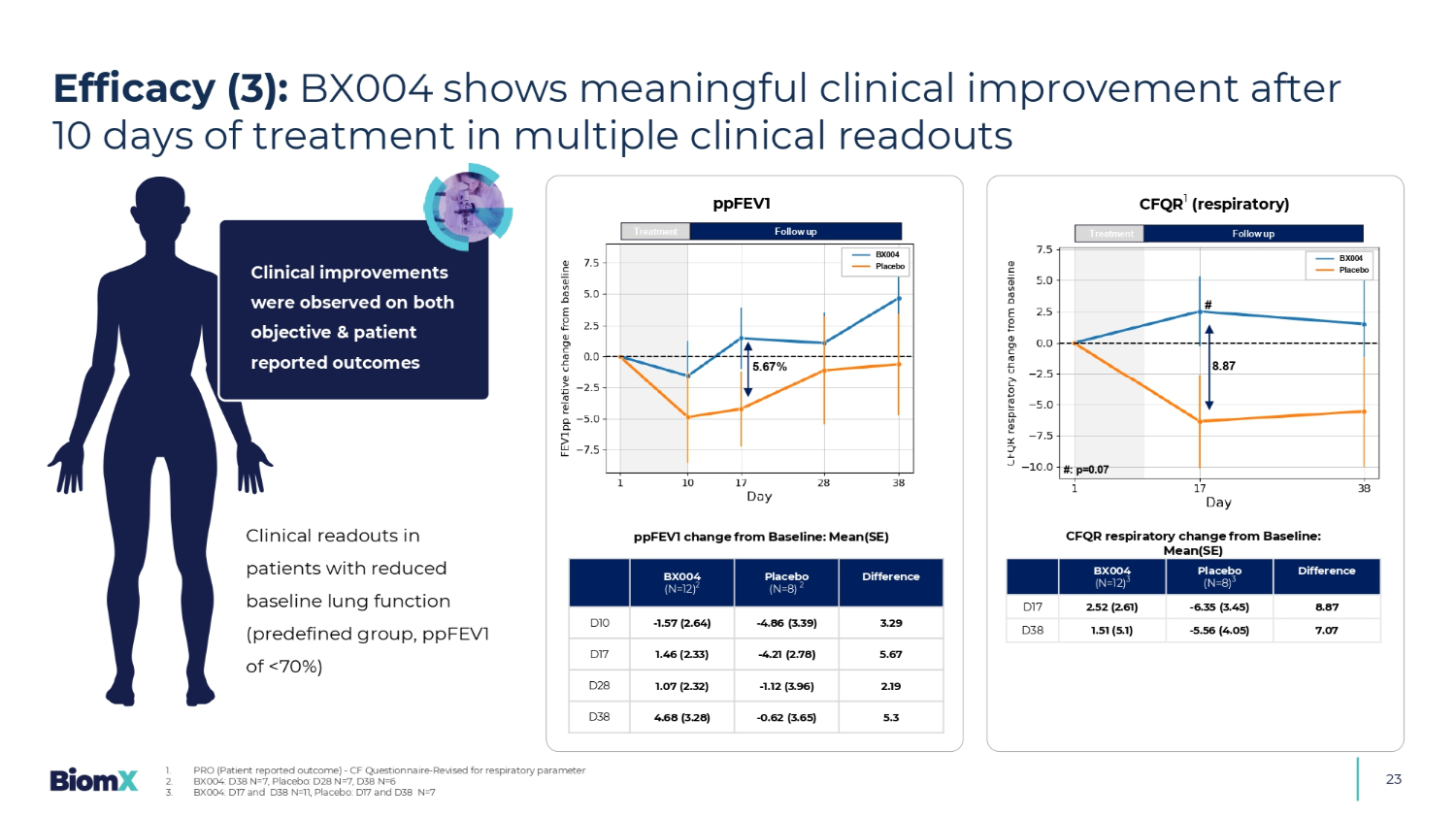 基线肺功能减退患者临床读数(预定义组,< 70%的ppFEV1)差异安慰剂(N = 8)2 bX004(N = 12)23.29-4.86(3.39)-1.57(2.64)D10 5.67-4.21(2.78)1.46(2.33)D17 2.19-1.12(3.96)1.07(2.32)D28 5.3-0.62(3.65)4.68(3.28)D38差异安慰剂(N = 8)3 bX004(N = 12)38.87-6.35(3.45)2.52(2.61)D17 7.07-5.56(4.05)1.51(5.1)D38 ppFEV1较基线变化:平均(SE)CFQR较基线呼吸变化:平均(SE)治疗5.67%随访ppFEV1 bX004治疗10天后在多个临床读数1。PRO(患者报告的结果)-CF调查问卷-针对呼吸参数2进行了修订。BX004:D38 N = 7,安慰剂:D28 N = 7,D38 N = 63。BX004:D17和D38 N = 11,安慰剂:D17和D38 N = 7在客观和患者报告的结果上均观察到临床改善