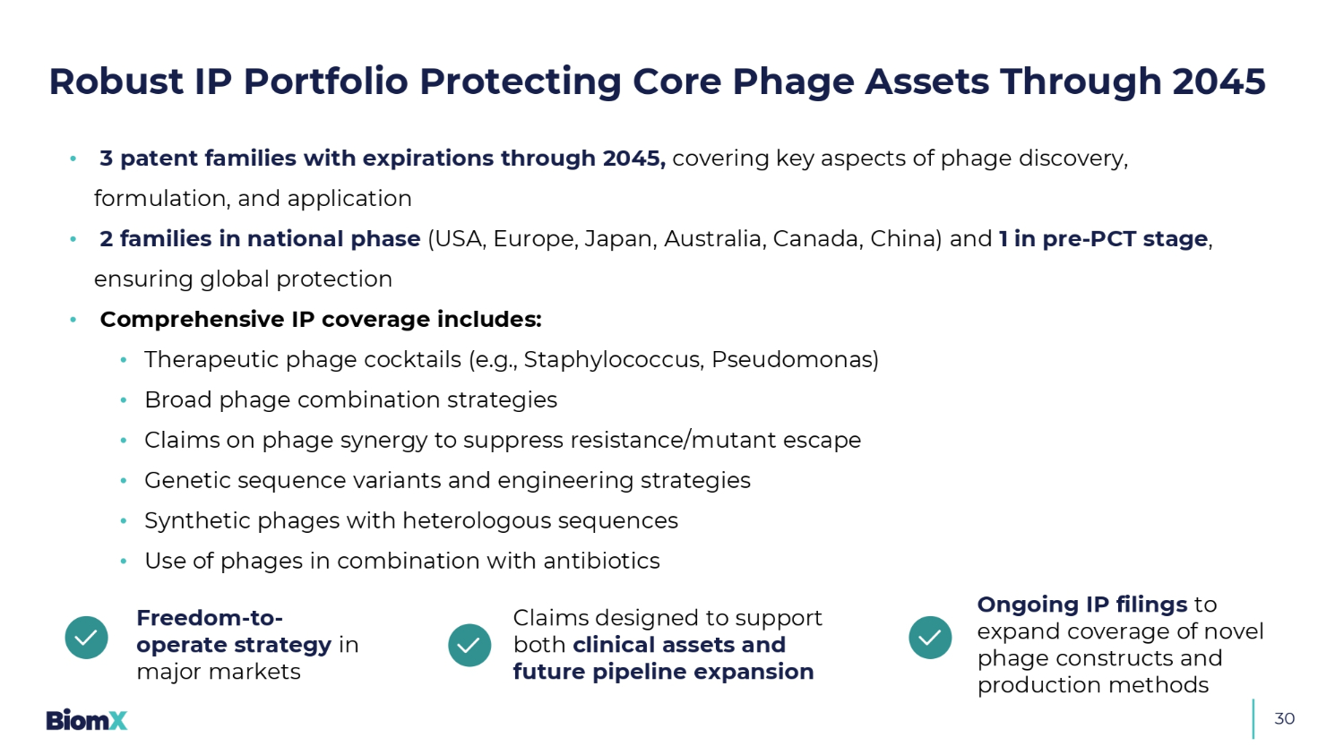 30 • 3个专利家族到2045年到期,涵盖噬菌体发现、配制和应用的关键方面• 2个家族处于国家阶段(美国、欧洲、日本、澳大利亚、加拿大、中国),1个处于PCT前阶段,确保全球保护•全面的IP覆盖包括:•治疗性噬菌体混合物(例如,葡萄球菌,假单胞菌)•广泛的噬菌体组合策略•关于噬菌体协同作用以抑制耐药/突变体逃逸的声明•基因序列变异和工程策略•具有异源序列的合成噬菌体•在主要市场使用噬菌体与抗生素联合使用自由运营策略旨在支持临床资产和未来管道扩展的持续IP申报,以扩大新型噬菌体构建体和生产方法的覆盖范围到2045年保护核心噬菌体资产的稳健IP组合