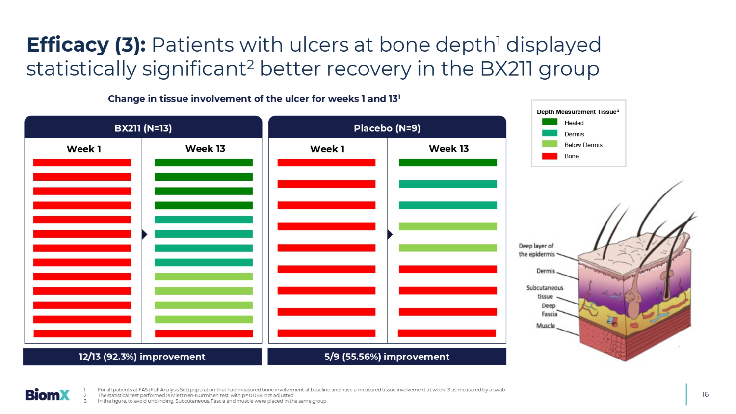 16第1周和第13周1周1周溃疡组织受累变化13BX211(N = 13)安慰剂(N = 9)第1周第13周12/13(92.3%)改善5/9(55.56%)改善深度测量组织3皮层以下愈合皮层疗效(3):骨深度1处溃疡患者在BX211组1中显示出具有统计学意义的2更好的恢复。对于在基线时测量过骨受累并且在第13周有实测tis sue受累的FAS(全分析集)人群中的所有患者,通过拭子2测量。进行的统计检验为Miettinen-Nurminen检验,p = 0.048,未调整3。图中,,为避免揭盲,皮下、筋膜和肌肉同组放置。