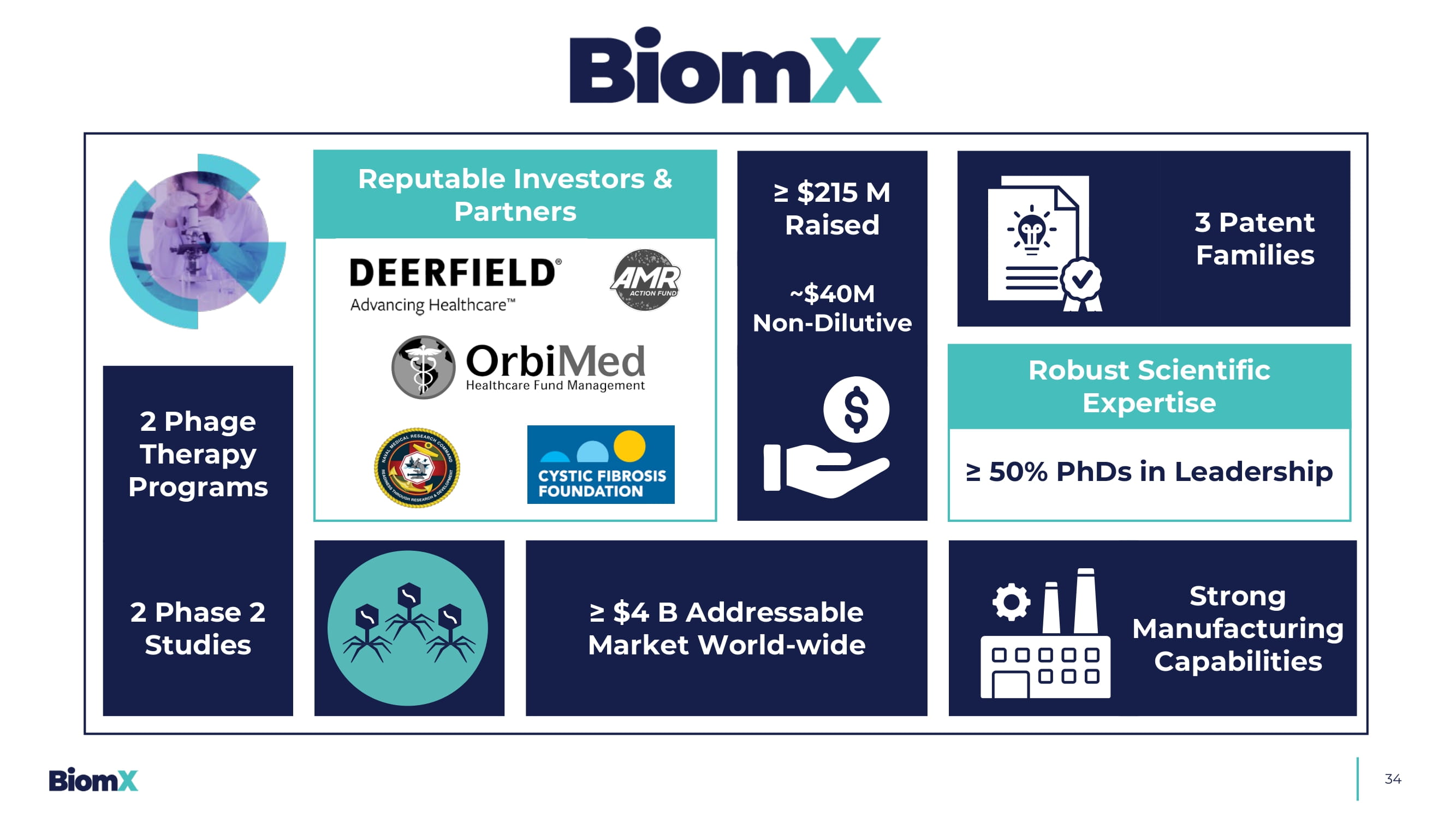 342个噬菌体治疗计划2个2期研究≥ $ 4B可寻址市场全球范围≥ $ 2.15亿筹集3个专利家族强大的制造能力信誉良好的投资者和合作伙伴≥ 50%的领导力博士& UHDWHG E \$ ITRK IURP 1RXQ 3URMHFW稳健的科学专长