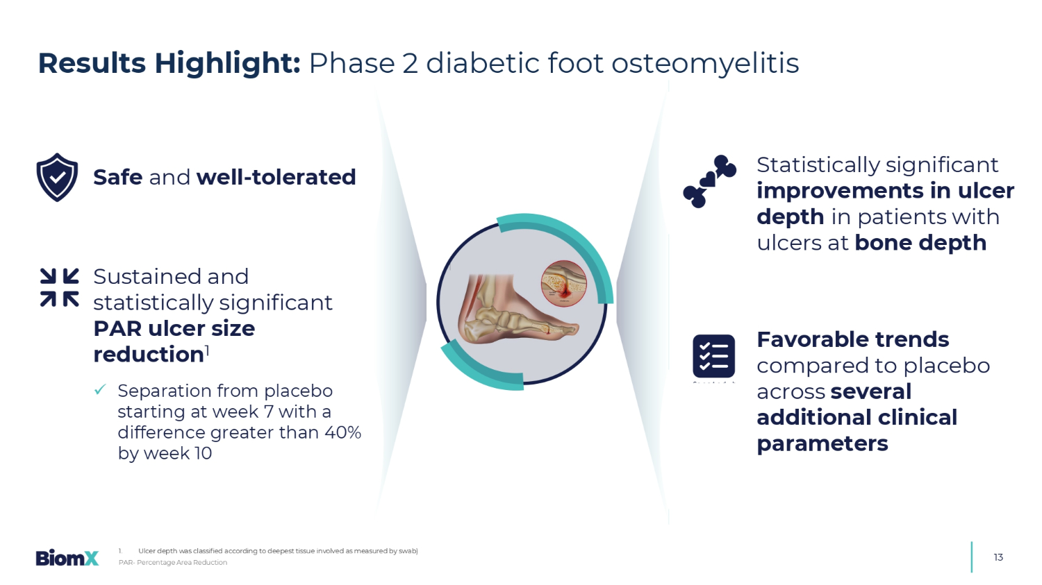 13 PAR-百分比面积减少结果突出显示:2期糖尿病足骨髓炎1。根据通过拭子测量的最深受累组织对溃疡深度进行分类)S afe和耐受性良好的S染色且具有统计学意义的PAR溃疡大小减少1 x S从第7周开始与安慰剂分离,到第10周差异超过40% & UHDWHG E \,1 $ IURP 1RXQ 3URMHFW在骨深度溃疡患者中的溃疡深度有统计学意义的改善F在几个额外的临床参数中与安慰剂相比的可取性趋势