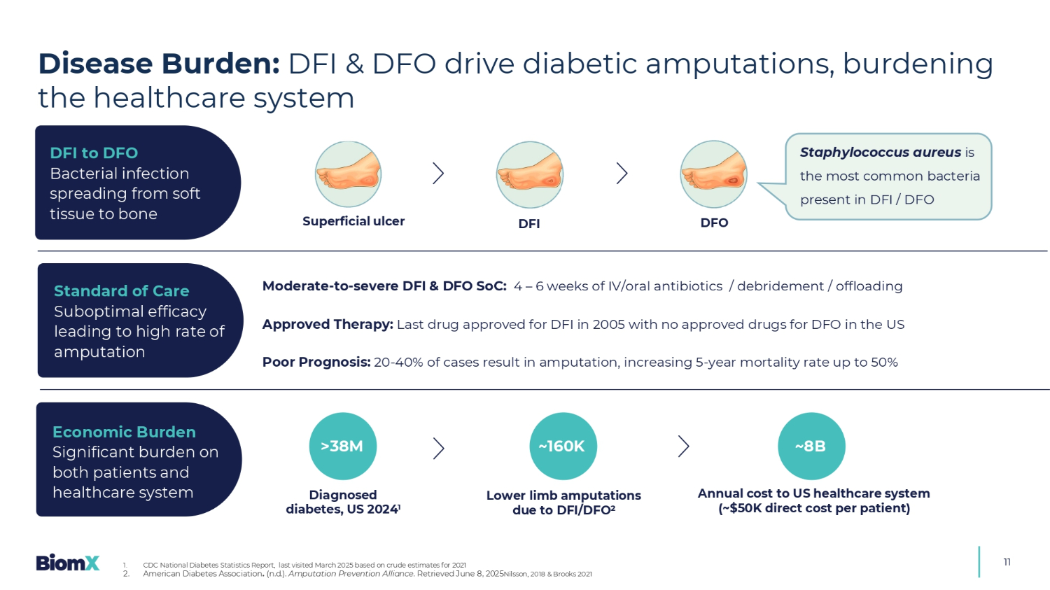 11浅层溃疡DFI DFO金黄色葡萄球菌是DFI/DFO中重度DFI & DFO SOC中最常见的细菌:4 – 6周的静脉注射/口服抗生素/清创/卸载批准疗法:最后一种药物于2005年被批准用于DFI,美国没有批准用于DFO的药物预后不良:20-40%的病例导致截肢,增加5年死亡率高达50% > 38M诊断的糖尿病,美国2024年度1次因DFI/DFO2导致的下肢截肢给美国医疗保健系统带来的年度成本(每位患者直接成本约为5万美元)~8B次DFI到DFO细菌感染从软组织传播到骨骼护理标准不理想的疗效导致高截肢率经济负担给患者和医疗保健系统带来了重大负担~160K疾病负担:DFI & DFO驱动糖尿病截肢,给医疗保健系统带来负担1。CDC全国糖尿病统计报告,最后一次访问是2025年3月,基于2021年的粗略估计2。美国糖尿病协会。(n.d.)。截肢预防联盟。2025年6月8日检索Nilsson,2018 & Brooks 2021