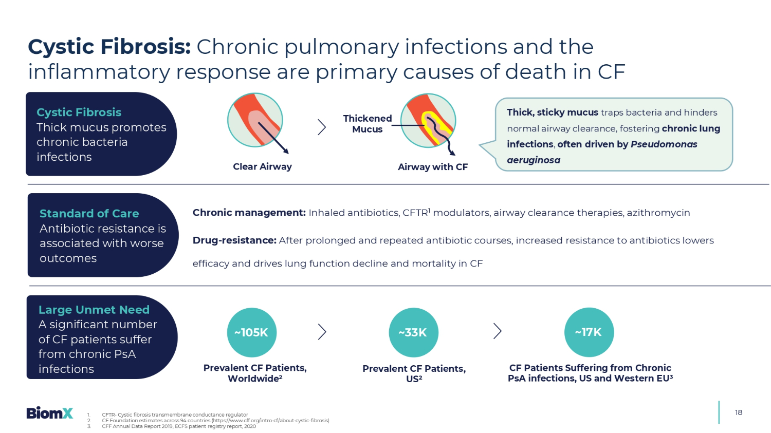 18清澈的气道浓密、黏稠的粘液捕获细菌,阻碍正常的气道清除,助长慢性肺部感染,常由铜绿假单胞菌驱动慢性管理:吸入式抗生素、CFTR1调节剂、气道清除疗法、阿奇霉素耐药性:在长时间和重复的抗生素疗程后,增加对抗生素的耐药性会降低疗效,并导致CF~105K流行CF患者的肺功能下降和死亡率,全球2例流行CF患者,美国2例患有慢性PSA感染的CF患者,美国和欧盟西部3~17K囊性纤维化粘液浓稠促进慢性细菌感染护理标准抗生素耐药性与更糟糕的结果相关大量未满足的需求大量CF患者患有慢性PSA感染~33K囊性纤维化:慢性肺部感染和炎症反应是CF 1死亡的主要原因。CFTR-囊性纤维化跨膜电导调节剂2。CF基金会对94个国家的估计(https://www.cff.org/intro-cf/about-cystic-fibrosis)3。CFF年度数据报告2019,ECFS患者登记报告,2020带CF增厚粘液的Airway