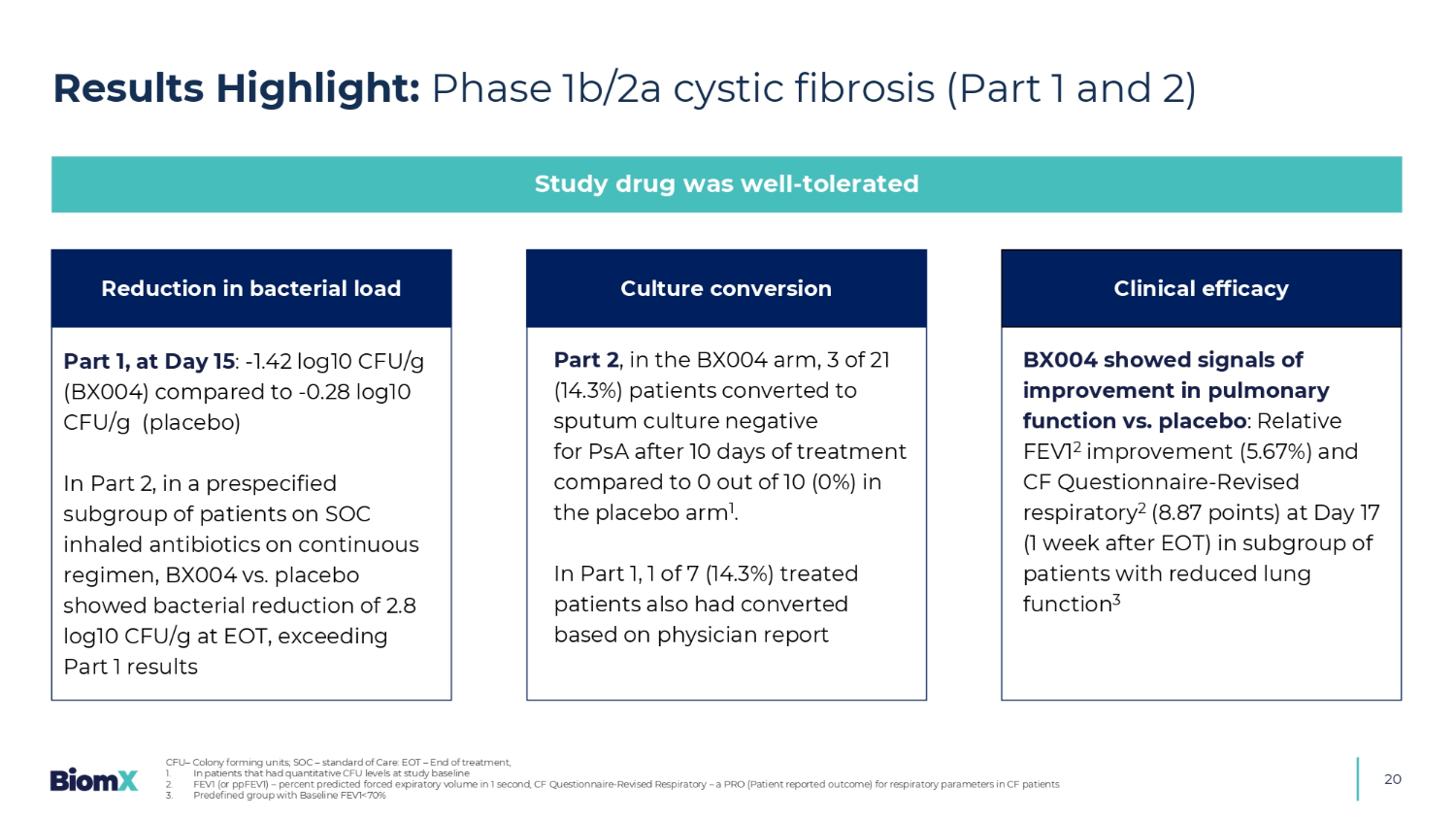 20结果亮点:1b/2a期囊性纤维化(第1和第2部分)研究药物耐受性良好第1部分,第15天:-1.42 log10 CFU/g(BX004)与-2部分中的-0.28 log10 CFU/g(安慰剂)相比,在SOC吸入抗生素持续方案的预先指定的患者亚组中,BX004与安慰剂在EOT时显示细菌减少2.8 log10 CFU/g,超过第1部分的结果BX004显示肺功能改善的信号与安慰剂相比:相对FEV1 2改善(5.67%)和CF调查问卷-肺功能降低亚组患者第17天(EOT后1周)修正的呼吸2(8.87分)3第2部分,在BX004组中,21名患者中有3名(14.3%)在治疗10天后转为痰培养PSA阴性,而安慰剂组1中有10名患者中有0名(0%)。在第1部分中,7名接受治疗的患者中有1名(14.3%)也有基于医生报告的转化细菌负荷培养转化减少的临床疗效CFU –菌落形成单位;SOC –护理标准:EOT –治疗结束,1。在研究基线2有定量CFU水平的患者中。FEV1(或ppFEV1)–百分比预测1秒内的强制呼气量,CF调查问卷-修订的呼吸系统–用于CF患者3呼吸参数的PRO(患者报告的结果)。基线FEV1 < 70%的预定义组
