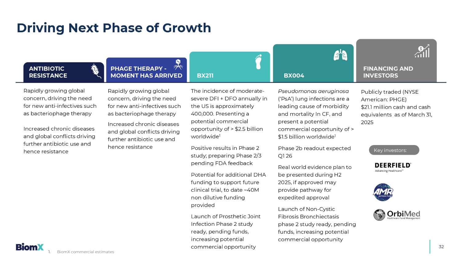 迅速增长的全球关注,推动对新型抗感染药物如噬菌体疗法的需求慢性疾病和全球冲突增加,推动进一步使用抗生素,从而产生耐药性美国每年中重度DFI + DFO的发病率约为40万。提供全球超过25亿美元的潜在商业机会1 P hase 2研究中的阳性结果;准备2/3期等待FDA反馈潜在的额外DHA资金以支持未来的临床试验,迄今为止,约4000万非稀释性资金提供了启动假体关节感染2期研究的准备,待获得资金,增加潜在的商业机会铜绿假单胞菌(‘PSA’)肺部感染是CF发病率和死亡率的主要原因,并在全球范围内提供超过15亿美元的潜在商业机会1 2b期读数预计Q1 26真实世界证据计划将于2025年H2期间提出,如果获得批准,可能会为加速批准启动非囊性纤维化支气管扩张2期研究提供途径,准备好、待定的资金、增加公开交易的潜在商业机会(纽约证券交易所美国股票代码:PHGE)截至2025年3月31日的2120万美元现金和现金等价物抗生药耐药阶段治疗-时刻已引起全球迅速增长的关注,推动对新型抗感染药物的需求,例如噬菌体疗法慢性疾病和全球冲突的增加,推动进一步使用抗生素,从而产生耐药性BX 211 BX004融资和投资者主要投资者:推动下一阶段的增长321。BiomX商业估算