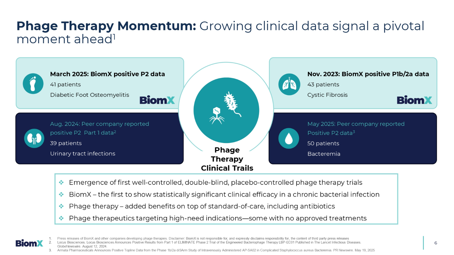 噬菌体治疗势头:不断增长的临床数据预示着未来的关键时刻16 □首个良好控制、双盲、安慰剂对照的噬菌体治疗试验的出现□ BiomX –第一个在慢性细菌感染中显示出具有统计学意义的临床effi c acy □噬菌体治疗–在标准护理之上增加益处s,包括抗生素□针对高需求适应症的噬菌体疗法——一些没有获得批准的治疗方法2025年3月:BiomX阳性P2数据41例患者糖尿病足骨髓炎2024年8月:同行公司报告阳性P2 Part 1数据239例患者尿路感染2025年5月:同行公司报告阳性P2数据350例患者菌血症噬菌体治疗临床轨迹2023年11月:BiomX阳性P1b/2a数据43例患者囊性纤维化1。BiomX和其他公司开发噬菌体疗法的新闻稿。免责声明:BiomX对第三方新闻稿2的内容概不负责,并明确表示概不负责。Locus Biosciences。Locus Biosciences宣布发表在《柳叶刀传染病》杂志上的工程化Bact eri ophage疗法LBP-EC01的ELIMINATE 2期试验第1部分的阳性结果。环球通讯社。2024年8月12日。3.Armata医药公布静脉给药AP-SA02治疗复杂金黄色葡萄球菌菌血症的1b/2a期dISARM研究的阳性顶线数据。美通社。2025年5月19日