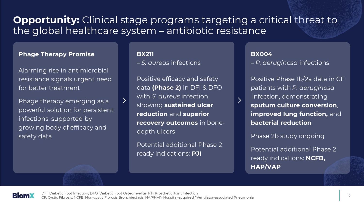 机会:针对全球医疗保健系统的严重威胁的临床阶段项目–抗生素耐药性3噬菌体疗法承诺令人震惊的抗菌药物耐药性上升表明迫切需要更好的治疗,噬菌体疗法正在成为持续感染的有力解决方案,越来越多的疗效和安全性数据支持BX211 –金黄色葡萄球菌感染P阳性疗效和安全性数据(2期)在DFI和DFO伴金黄色葡萄球菌感染中,在骨深部溃疡中显示出持续的溃疡减少和卓越的恢复结果潜在的额外2期准备适应症:PJI BX004 –铜绿假单胞菌感染在CF铜绿假单胞菌感染患者中的阳性1b/2a期数据,证明痰培养转化、肺功能改善和细菌减少2b期研究正在进行潜在的a附加2期准备适应症:NCFB、HAP/VAP DFI:糖尿病足感染;DFO:糖尿病足骨髓炎;PJI:假体关节感染CF:囊性纤维化;NCFB:非囊性纤维化支气管扩张;HAP丨/HVP:医院-获得性/呼吸机-相关性肺炎