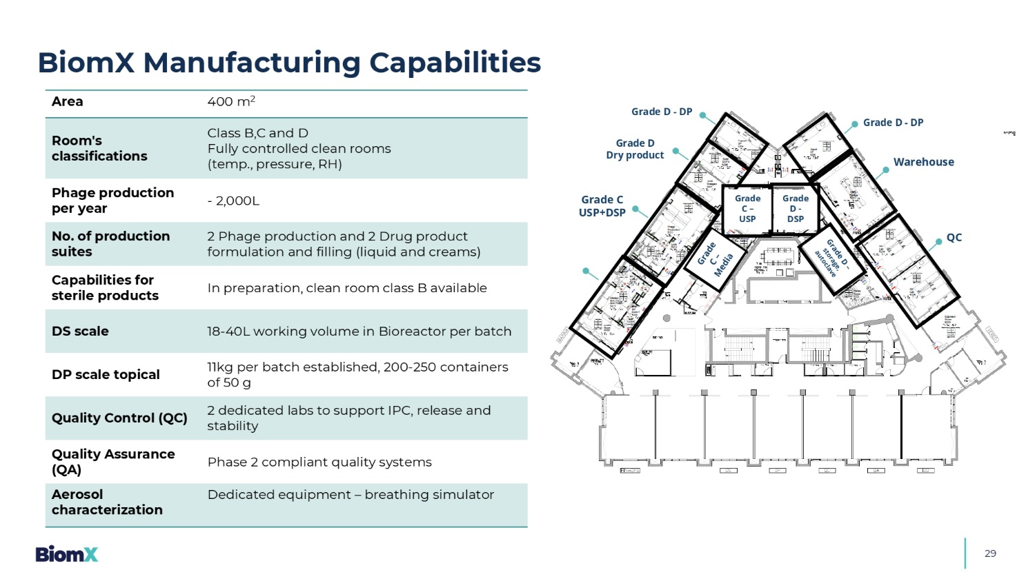 29400米2区域B、C、D类全控洁净室(温度、压力、RH)室的分类-年产2,000L噬菌体2个噬菌体生产和2个药物产品配方和灌装(液体和乳膏)在制生产套件数量,洁净室B类可用于无菌产品的能力18-40L工作容积在生物反应器每批次DS规模11kg每批次建立,200-250个容器50 g DP规模外用2个专用实验室支持IPC,释放和稳定性质量控制(QC)第2阶段合规质量体系质量保证(QA)专用设备–呼吸模拟器气溶胶表征BiomX制造能力C级USP + DSP D级干品D级-DP D级-DP D级-DSP C级– USP仓库QC