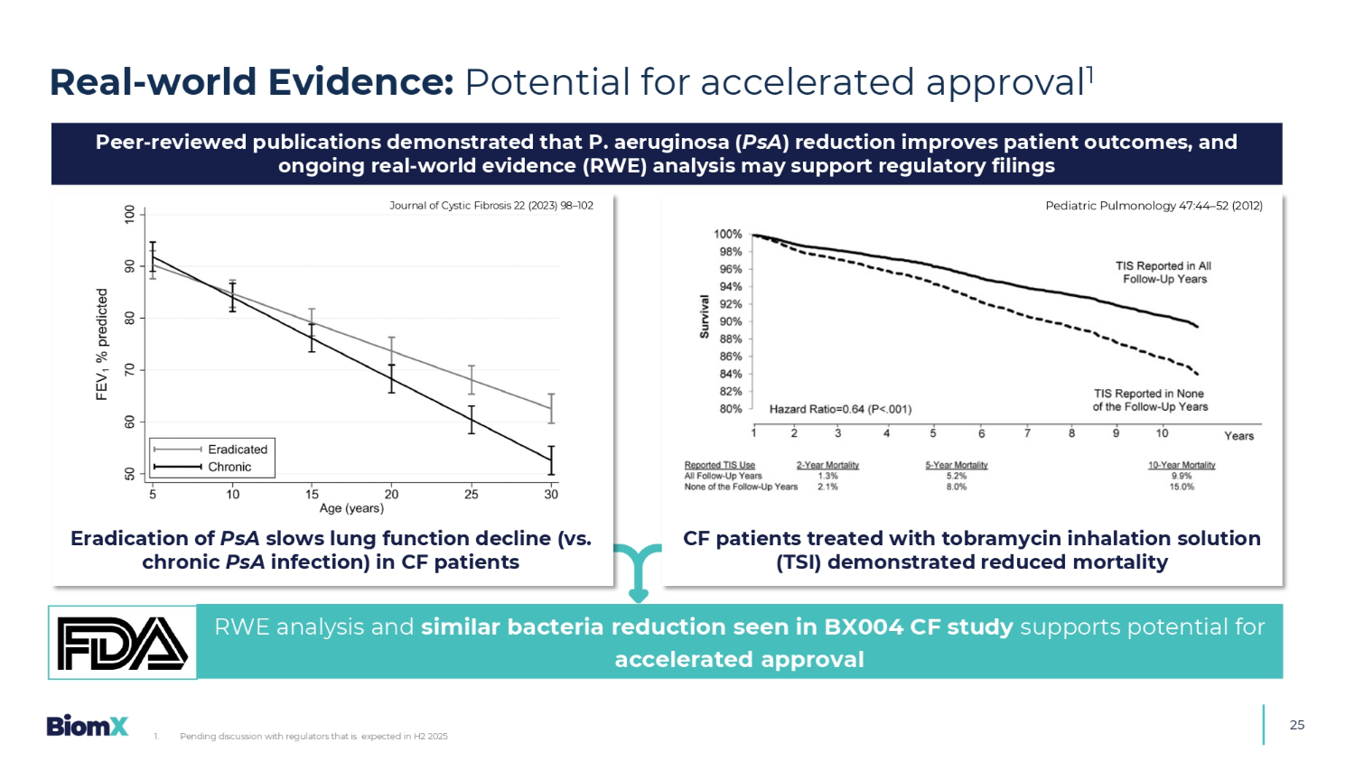 25篇同行评审的出版物表明,铜绿假单胞菌(PSA)减少可改善患者预后,正在进行的真实世界证据(RWE)分析可能支持监管备案真实世界证据:加速批准的潜力RWE分析和在BX004 CF研究中看到的类似细菌减少支持加速批准根除PSA的潜力减缓CF患者的肺功能下降(vs.慢性PSA感染)接受妥布霉素吸入溶液(TSI)治疗的CF患者证明降低了死亡率囊性纤维化杂志22(2023)98 – 102儿科肺病学47:44 – 52(2012)
