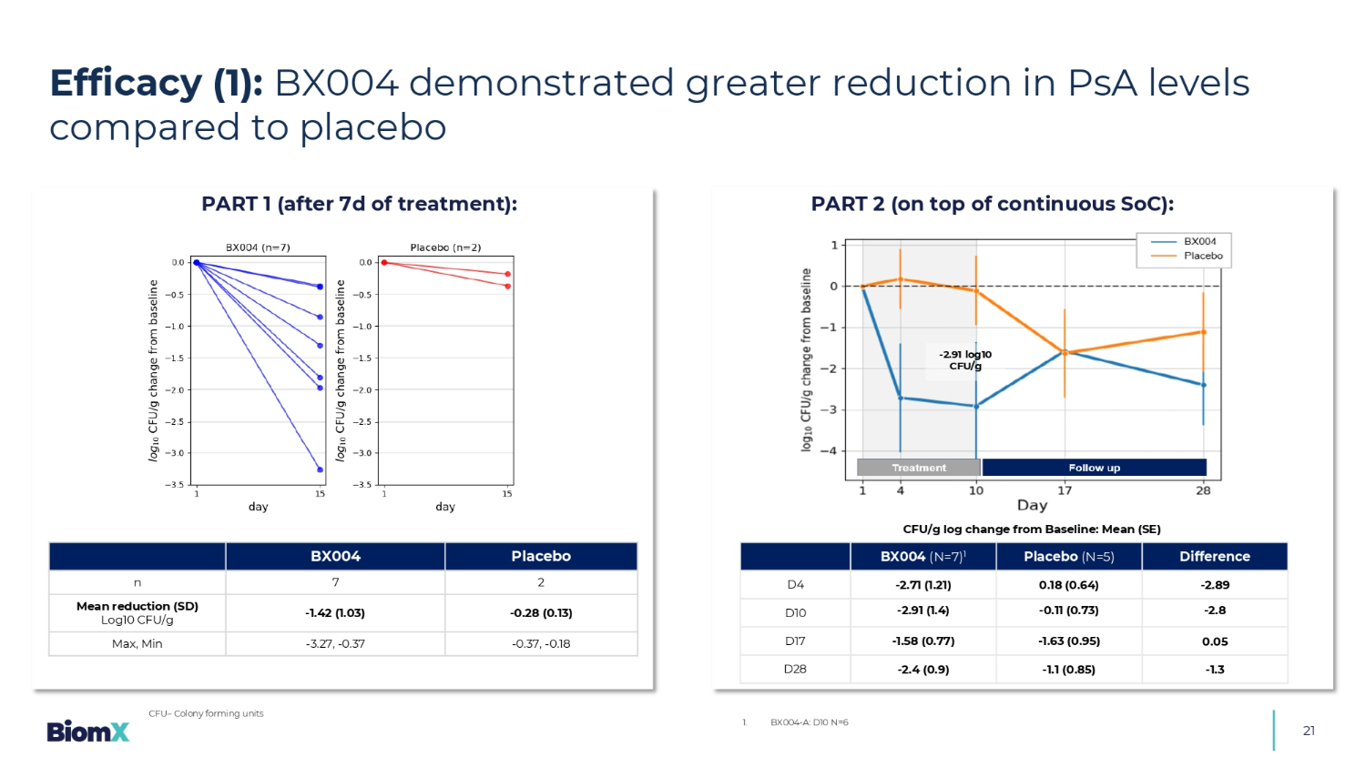 21安慰剂BX004 27 n-0.28(0.13)-1.42(1.03)平均减少量(SD)log10 CFU/g-0.37,-0.18-3.27,-0.37 Max,最小功效(1):与安慰剂CFU相比,BX004显示出更大的PSA水平降低–集落形成单位-2.91 log10 CFU/g第1部分(治疗7d后):第2部分(在连续SoC之上):差异安慰剂(N = 5)BX004(N = 7)1-2.89 0.18(0.64)-2.71(1.21)D4-2.8-0.11(0.73)-2.91(1.4)D10 0.05-1.63(0.95)-1.58(0.77)D17-1.3-1.1(0.85)-2.4(0.9)D28 1。BX004-A:D10 N = 6CFU/g对数较基线变化:均值(SE)