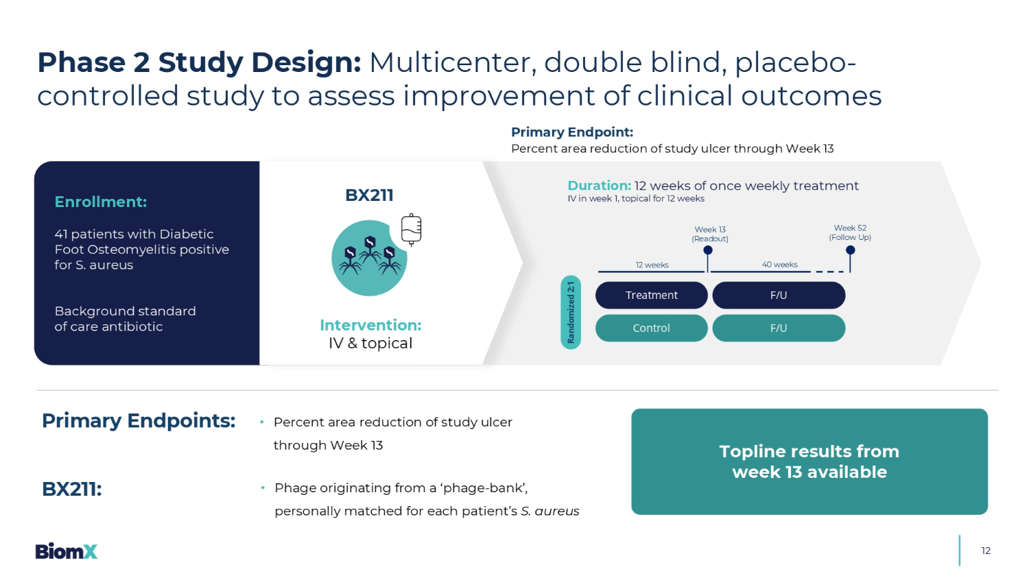 治疗对照随机2:1第13周(R eadout)第52周(随访)12周40周F/U F/U 12持续时间:第1周每周一次静脉治疗12周,局部12周入组:41例糖尿病足骨髓炎患者金黄色葡萄球菌阳性护理抗生素的背景标准主要终点:第13周研究溃疡面积减少百分比BX211干预:IV &局部•第13周研究溃疡面积减少百分比主要终点:•源自‘噬菌体-库’的噬菌体,为每位患者的金黄色葡萄球菌BX211亲自匹配:第13周的顶线结果可用2期研究设计:多中心、双盲、安慰剂对照研究,以评估临床结果的改善