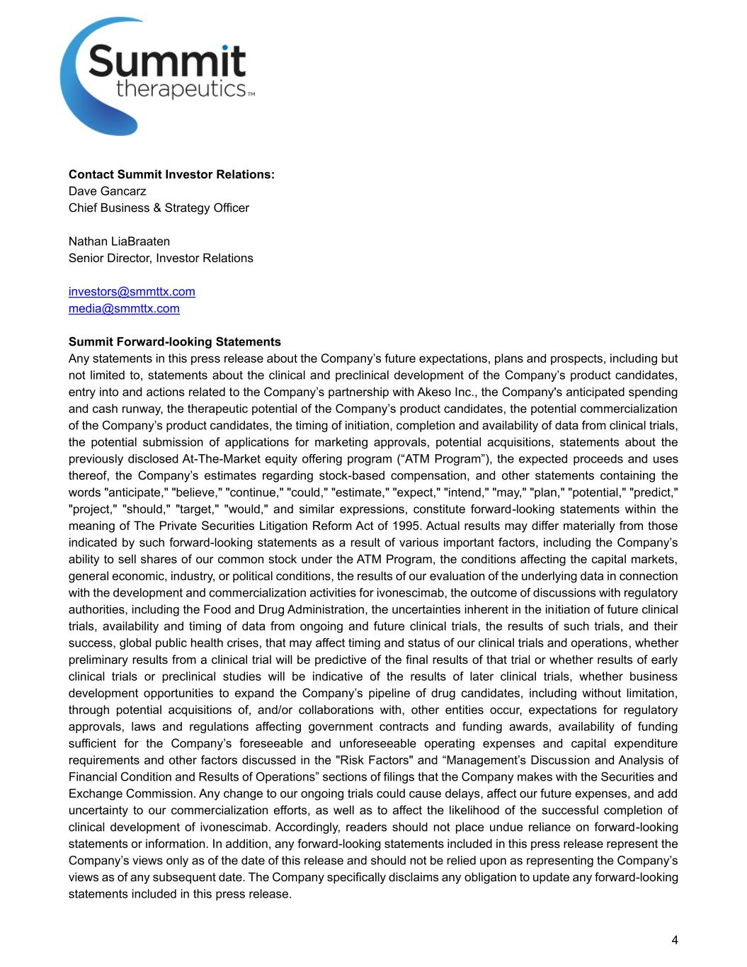 4联系峰会投资者关系:Dave Gancarz首席业务和战略官Nathan LiaBraaten投资者关系高级总监Investors@smmttx.com media@smmttx.com峰会前瞻性陈述本新闻稿中关于公司未来预期、计划和前景的任何陈述,包括但不限于关于公司候选产品的临床和临床前开发、与公司与Akeso Inc.的合作关系相关的进入和行动的陈述、公司预期的支出和现金跑道、公司候选产品的治疗潜力、公司候选产品的潜在商业化、启动时间,临床试验数据的完成和可用性、可能提交的上市批准申请、潜在收购、关于先前披露的市场上股票发行计划(“ATM计划”)的陈述、预期收益和用途、公司关于基于股票的薪酬的估计,以及包含“预期”、“相信”、“继续”、“可能”、“估计”、“预期”、“打算”、“可能”、“计划”、“潜在”、“预测”、“项目”、“应该”、“目标”、“将”和类似表述,构成1995年《私人证券诉讼改革法案》含义内的前瞻性陈述。由于各种重要因素,实际结果可能与此类前瞻性陈述所表明的结果存在重大差异,包括公司根据ATM计划出售我们普通股的能力、影响资本市场的条件、总体经济、行业或政治状况、我们对与ivonescimab的开发和商业化活动相关的基础数据的评估结果、与包括食品和药物管理局在内的监管机构讨论的结果、未来临床试验启动所固有的不确定性,来自正在进行和未来临床试验的数据的可用性和时间、此类试验的结果及其成功、全球公共卫生危机,这可能会影响我们临床试验和运营的时间和状态,临床试验的初步结果是否会预测该试验的最终结果,或早期临床试验或临床前研究的结果是否会指示后期临床试验的结果,是否会出现扩大公司候选药物管道的商业发展机会,包括但不限于通过潜在收购和/或与其他实体合作,对监管批准的预期、影响政府合同和资金奖励的法律法规、足以满足公司可预见和不可预见的运营费用和资本支出要求的资金的可用性以及公司向美国证券交易委员会提交的文件的“风险因素”和“管理层对财务状况和运营结果的讨论和分析”部分中讨论的其他因素。我们正在进行的试验的任何改变都可能导致延误,影响我们未来的开支,并为我们的商业化努力增加不确定性,以及影响成功完成ivonescimab临床开发的可能性。因此,读者不应过分依赖前瞻性陈述或信息。此外,本新闻稿中包含的任何前瞻性陈述仅代表公司截至本新闻稿发布之日的观点,不应被视为代表公司截至任何后续日期的观点。该公司明确表示不承担更新本新闻稿中包含的任何前瞻性陈述的任何义务。