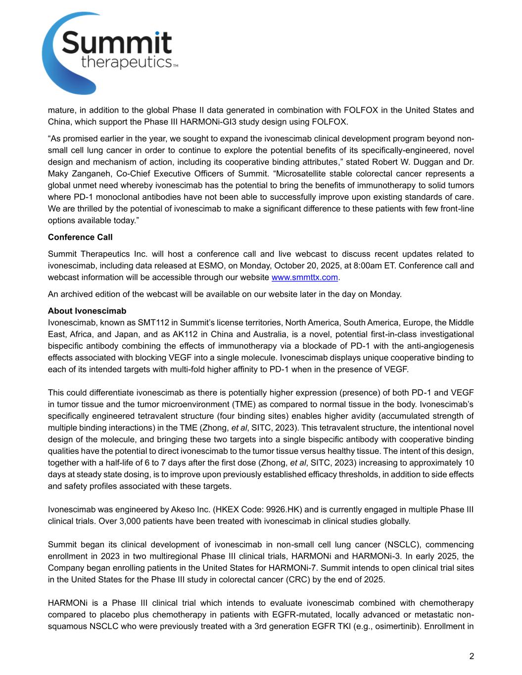 2项成熟,此外美国和中国结合FOLFOX生成的全球II期数据,支持使用FOLFOX进行III期HarMONi-GI3研究设计。“正如今年早些时候承诺的那样,我们寻求将ivonescimab临床开发计划扩展到非小细胞肺癌之外,以继续探索其专门设计的、新颖的设计和作用机制的潜在益处,包括其合作结合属性,”Summit联席首席执行官Robert W. Duggan和Maky Zanganeh博士表示。“微卫星稳定性结直肠癌代表了一种全球未被满足的需求,由此,ivonescimab有可能为PD-1单克隆抗体未能成功改善现有护理标准的实体瘤带来免疫疗法的益处。我们对ivonescimab的潜力感到兴奋,它可以为这些目前几乎没有一线选择的患者带来重大改变。”电话会议Summit Therapeutics公司将于美国东部时间2025年10月20日(星期一)上午8:00举办电话会议和网络直播,讨论与ivonescimab相关的最新更新,包括在ESMO上发布的数据。电话会议和网络直播信息可通过我们的网站www.smmttx.com查阅。网络直播的存档版本将于周一晚些时候在我们的网站上提供。关于ivonescimab ivonescimab,在Summit的许可地区、北美、南美、欧洲、中东、非洲和日本被称为SMT112,在中国和澳大利亚被称为AK112,是一种新型的、潜在的first-in-class在研双特异性抗体,将通过阻断PD-1的免疫疗法的效果与与将VEGF阻断成单一分子相关的抗血管生成作用相结合。当存在VEGF时,ivonescimab显示出与其每个预期靶点的独特合作结合,对PD-1的亲和力高出多倍。这可以区分ivonescimab,因为与体内正常组织相比,PD-1和VEGF在肿瘤组织和肿瘤微环境(TME)中的表达(存在)可能更高。ivonescimab的特异性工程四价结构(四个结合位点)可在TME中实现更高的亲和力(多重结合相互作用的积累强度)(Zhong,et al,SITC,2023)。这种四价结构,有意对分子进行新颖设计,并将这两个靶点带入具有协同结合品质的单一双特异性抗体中,有可能将ivonescimab导向肿瘤组织而不是健康组织。这种设计的目的,连同第一次给药后6至7天的半衰期(Zhong等人,SITC,2023年)在稳态给药时增加到大约10天,除了与这些靶点相关的副作用和安全性特征外,还旨在改善先前确定的疗效阈值。Ivonescimab由Akeso Inc.(港交所代码:9926.HK)设计,目前正在进行多个III期临床试验。全球已有超过3000名患者在临床研究中接受了ivonescimab治疗。Summit开始其ivonescimab在非小细胞肺癌(NSCLC)中的临床开发,于2023年开始在两项多区域III期临床试验中注册,即HarMONI和HarMONI-3。2025年初,该公司开始在美国为HARMONI-7招募患者。Summit打算在2025年底之前在美国开设结直肠癌(CRC)III期研究的临床试验地点。Harmoni是一项III期临床试验,旨在评估先前接受过第3代EGFR TKI(例如奥希替尼)治疗的EGFR突变、局部晚期或转移性非鳞状NSCLC患者中ivonescimab联合化疗与安慰剂加化疗的比较。入学人数