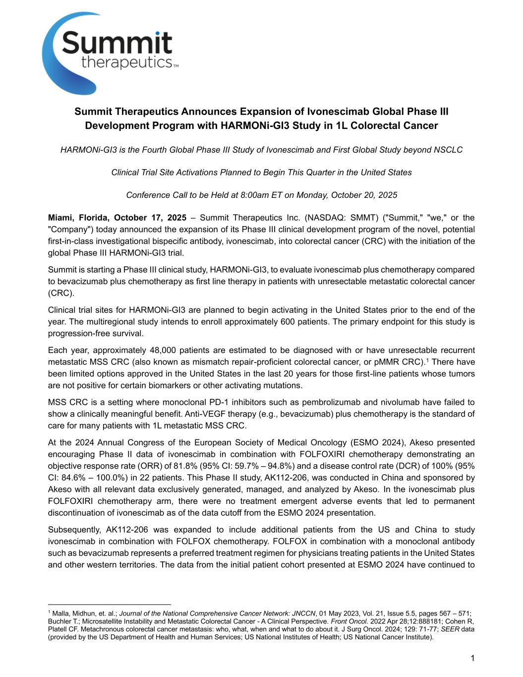 1 Summit Therapeutics宣布扩大ivonescimab全球III期开发计划,在1L结直肠癌中开展HARMONi-GI3研究HARMONi-GI3是ivonescimab的第四项全球III期研究,也是计划于本季度在美国开始的第一项超越NSCLC临床试验场所激活的全球研究,电话会议将于美国东部时间2025年10月20日星期一上午8:00举行,佛罗里达州迈阿密,2025年10月17日–丨Summit Therapeutics Inc. Summit Therapeutics Inc.(纳斯达克股票代码:SMMT)(“Summit,”“我们,”或“公司”)今天宣布,随着全球III期HARMONi-GI3试验的启动,扩大其新型、潜在的一流研究双特异性抗体ivonescimab的III期临床开发计划,用于结直肠癌(CRC)。Summit正在启动一项III期临床研究,即HARMONi-GI3,以评估ivonescimab加化疗与贝伐珠单抗加化疗作为一线疗法在不可切除的转移性结直肠癌(CRC)患者中的对比。HARMONi-GI3的临床试验站点计划于年底前在美国开始启用。这项多区域研究计划招募约600名患者。这项研究的主要终点是无进展生存期。据估计,每年约有48,000名患者被诊断患有或患有不可切除的复发性转移性MSS CRC(也称为错配修复熟练结直肠癌,或pMMR CRC)。1过去20年,美国批准的用于那些肿瘤对某些生物标志物或其他激活突变没有阳性的一线患者的选择非常有限。MSS CRC是帕博利珠单抗和纳武利尤单抗等单克隆PD-1抑制剂未能显示出具有临床意义的益处的环境。抗VEGF疗法(例如贝伐珠单抗)加化疗是许多1L转移性MSS CRC患者的标准护理。在欧洲内科肿瘤学会2024年度大会(ESMO2024)上,Akeso展示了令人鼓舞的ivonescimab联合FOLFOXIRI化疗的II期数据,证明22名患者的客观缓解率(ORR)为81.8%(95% CI:59.7% – 94.8%)和疾病控制率(DCR)为100%(95% CI:84.6% – 100.0%)。这项名为AK112-206的II期研究在中国进行,由Akeso赞助,所有相关数据均由Akeso独家生成、管理和分析。在ivonescimab加FOLFOXIRI化疗组中,截至ESMO2024演示文稿的数据截止时,没有出现导致永久停用ivonescimab的治疗紧急不良事件。随后,AK112-206扩大到包括来自美国和中国的更多患者,以研究ivonescimab与FOLFOX化疗联合使用。FOLFOX与贝伐珠单抗等单克隆抗体联合使用代表了治疗美国和其他西部地区患者的医生的首选治疗方案。在ESMO 2024上展示的初始患者队列的数据一直持续到1 malla,midhun,et al.;Journal of the National Comprehensive Cancer Network:JNCCN,2023年5月1日,Vol.21,Issue 5.5,pages 567 – 571;Buchler T.;microsatellite instability and metastatic colorectal cancer-a clinical perspective。Front Oncol。2022Apr 28;12:888181;科恩 R,Platell CF.异时性结直肠癌转移:针对谁,做什么,什么时候做什么。J Surg Oncol。2024;129:71-77;SEER数据(由美国卫生与公众服务部;美国国立卫生研究院;美国国立癌症研究所提供)。