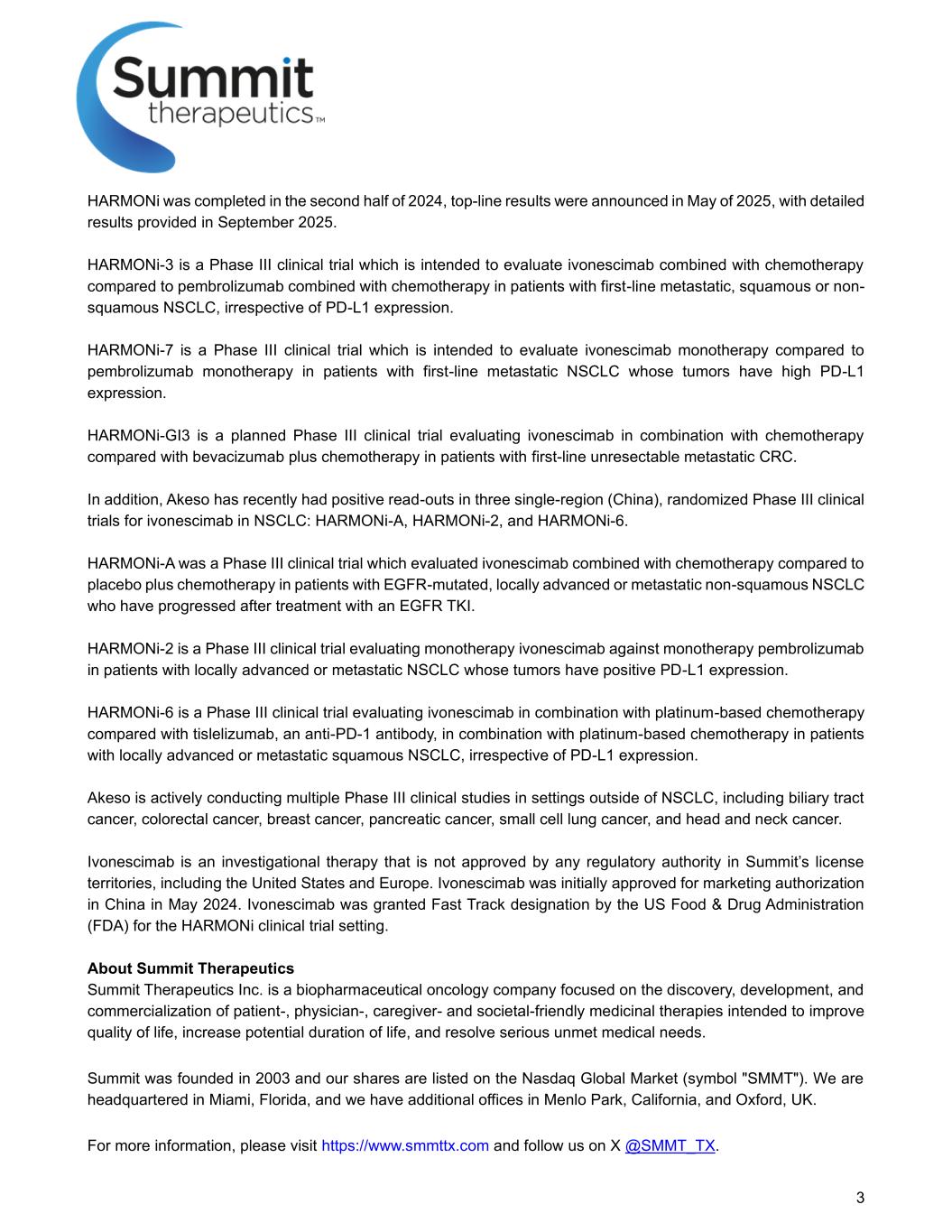 3 HARMONI于2024年下半年完成,顶线业绩于2025年5月公布,详细业绩于2025年9月提供。Harmoni-3是一项III期临床试验,旨在评估ivonescimab联合化疗与pembrolizumab联合化疗在一线转移性、鳞状或非鳞状NSCLC患者中的比较,无论PD-L1表达如何。Harmoni-7是一项III期临床试验,旨在评估肿瘤PD-L1高表达的一线转移性NSCLC患者中ivonescimab单药治疗与pembrolizumab单药治疗的对比。HARMONi-GI3是一项计划中的III期临床试验,评估ivonescimab联合化疗与贝伐珠单抗联合化疗在一线不可切除转移性CRC患者中的比较。此外,Akeso近期在3个单区(中国)、iVonescimab治疗NSCLC的随机III期临床试验中均有阳性读数:HARMONI-A、HARMONI-2、HARMONI-6。HARMONi-A是一项III期临床试验,在EGFR TKI治疗后进展的EGFR突变、局部晚期或转移性非鳞状NSCLC患者中评估ivonescimab联合化疗与安慰剂联合化疗的比较。HARMONI-2是一项III期临床试验,在肿瘤PD-L1表达阳性的局部晚期或转移性NSCLC患者中评估单一疗法ivonescimab对抗单一疗法pembrolizumab。Harmoni-6是一项III期临床试验,评估ivonescimab联合铂类化疗与抗PD-1抗体tislelizumab联合铂类化疗在局部晚期或转移性鳞状NSCLC患者中的疗效,无论PD-L1表达如何。Akeso正在NSCLC以外的环境中积极开展多个III期临床研究,包括胆道癌、结直肠癌、乳腺癌、胰腺癌、小细胞肺癌、头颈癌。Ivonescimab是一种研究性疗法,未获得Summit许可地区任何监管机构的批准,包括美国和欧洲。伊沃奈西单抗最初于2024年5月在中国获批上市许可。Ivonescimab被美国食品药品监督管理局(FDA)授予用于HarMONI临床试验设置的快速通道指定。关于Summit TherapeuticsSummit Therapeutics公司是一家生物制药肿瘤学公司,专注于发现、开发和商业化对患者、医生、护理人员和社会友好的药物疗法,旨在提高生活质量、增加潜在的生命持续时间并解决严重的未满足的医疗需求。Summit成立于2003年,我们的股票在纳斯达克全球市场上市(代码“SMMT”)。我们的总部设在佛罗里达州迈阿密,并在加利福尼亚州门洛帕克和英国牛津增设了办事处。欲了解更多信息,请登录https://www.smmttx.com,关注我们X @SMMT _ TX。