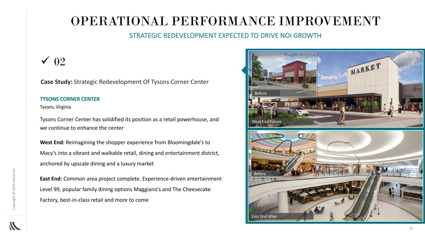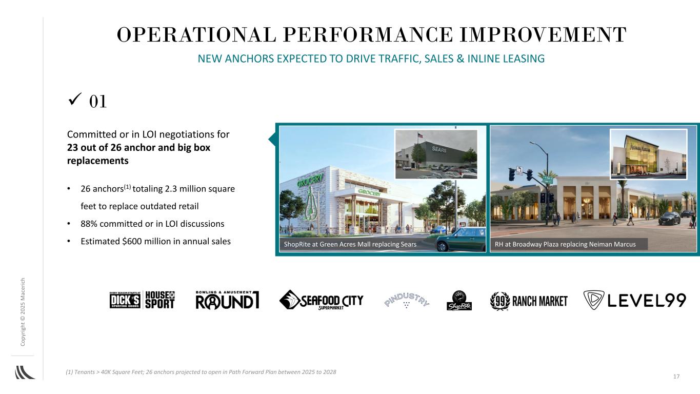C o p yr ig h t©202 5m AC ER IC H丨01承诺或正在LOI谈判中的26个锚定中的23个和大盒子取代Green Acres Mall的ShopRite取代Broadway Plaza的Sears RH取代Neiman Marcus • 26名主播(1)共230万平方英尺,以取代过时的零售•88%已承诺或正在讨论意向书•预计年销售额为6亿美元(1)租户> 40K平方英尺;26名主播预计将在2025年至2028年期间按Path Forward计划开业运营业绩改善预计将推动交通、销售和内联租赁的新主播17